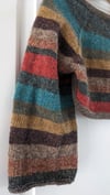 I have knitted a size 5 and used two packs of mini skeins from John Arbon Textiles in the Down the Allotment range. They were 100g each pack with 224 meters / 245 yards. I alternated the mini skeins which were 10g each up until dividing body and sleeves then wound them into 5g balls to match the sleeves stripe for stripe. A self-striping yarn would look fantastic in this, just check the meterage / yardage in the table below for the size you are knitting.