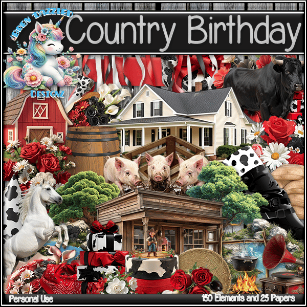 A cute little country birthday kit full of red black and white elements, that are partially ai. With 150 Elements and 25 Papers this kit is a must have.