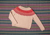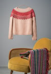 Esta camisola é tricotada de cima para baixo, em circular e sem costuras. Começamos por tricotar a gola e todo o encaixe com aumentos e o ponto jacquard. Nas cavas as malhas das mangas são deixadas em espera enquanto tricota o corpo em circular. No final, retomamos as malhas das mangas e tricotamos em circular até ao punho.