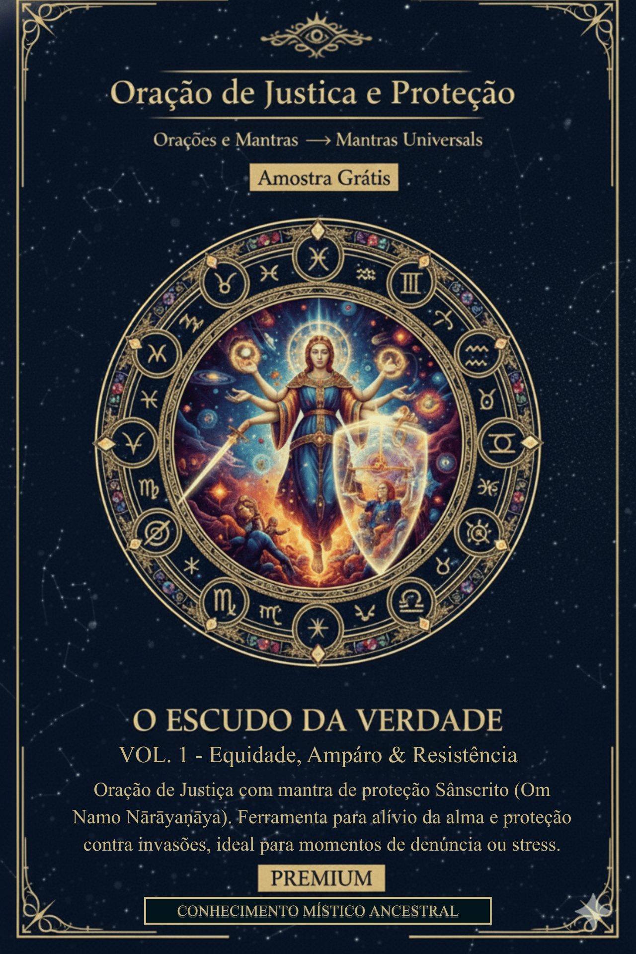 Quando a injustiça tenta ferir, este é o seu decreto de guerra sagrada. A Fiat Vox Veritatis transforma sua palavra em um Escudo Verbal e seu corpo em um templo inviolável. O Arcano une a força do Hebraico, Latim e o mantra Sânscrito (Om Namo Nārāyaṇāya) para invocar o Guardião Cósmico e o Juiz Justo.
