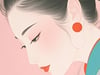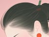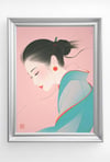 The large close-up of the woman's profile and the balance that makes use of the white space is excellent. Serenity and elegance coexist, making a deep impression on the viewer. The soft pink background is harmonious with the accent colors of pale blue green and vermilion red, giving it a very elegant finish. The lines of the hair and kimono are extremely smooth and refined, giving the impression of simple Japanese beauty (wabi-sabi). Serene emotions emanate from the face with the eyelids down, giving the viewer room for imagination.