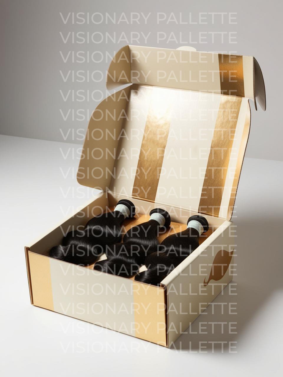 Mermaid Themed: realistic Beige and Gold Open subscription box with realistic black Wavy hair bundles inside