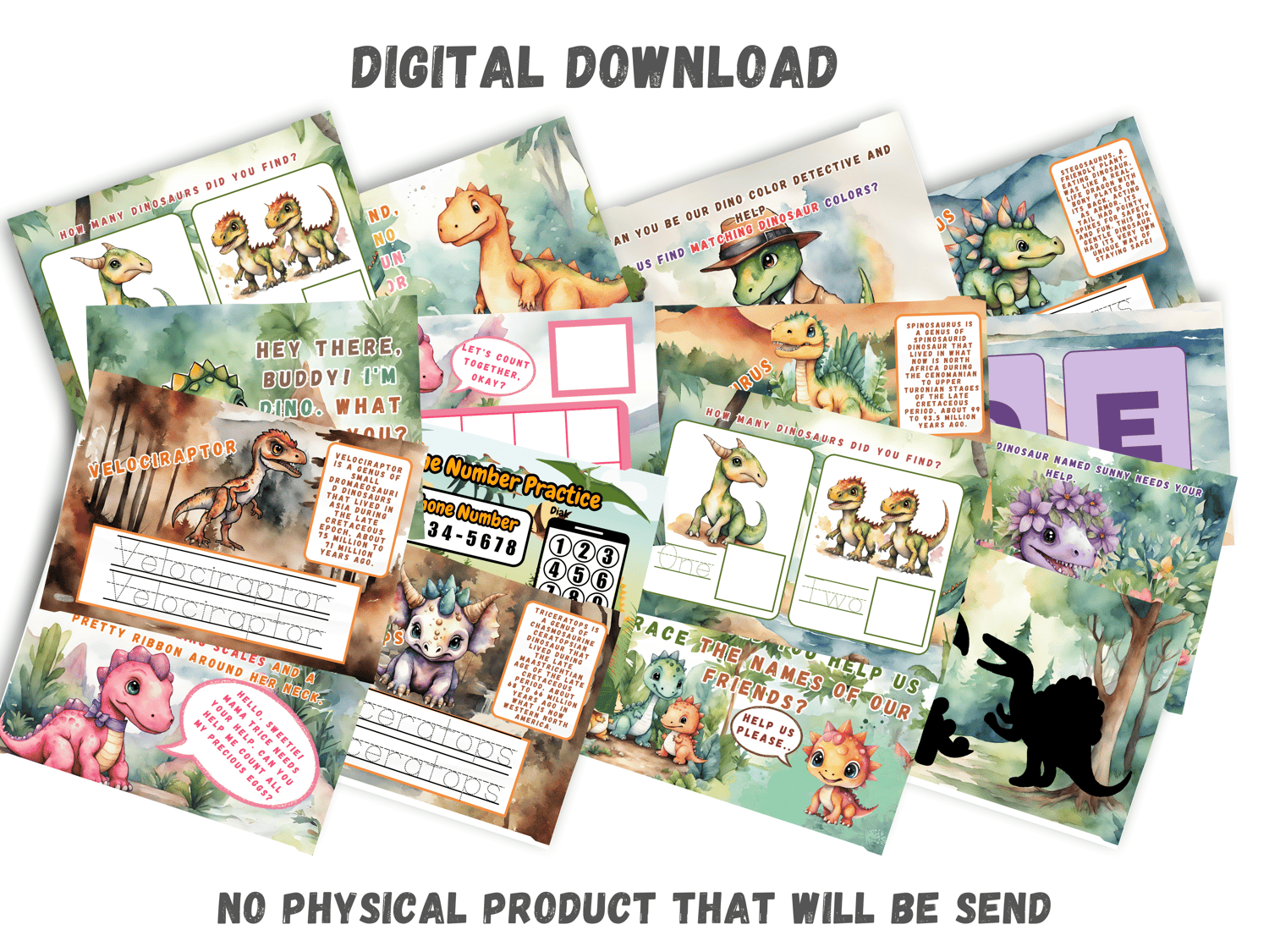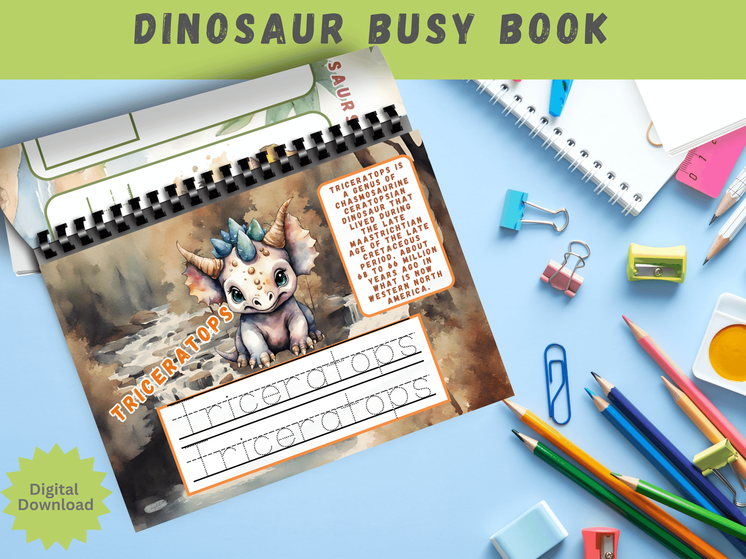 This activity busy book includes a variety of activities that are perfect for toddlers and kids, all themed around their favorite dinosaur with facts about the dinosaur illustrated in watercolour graphics.