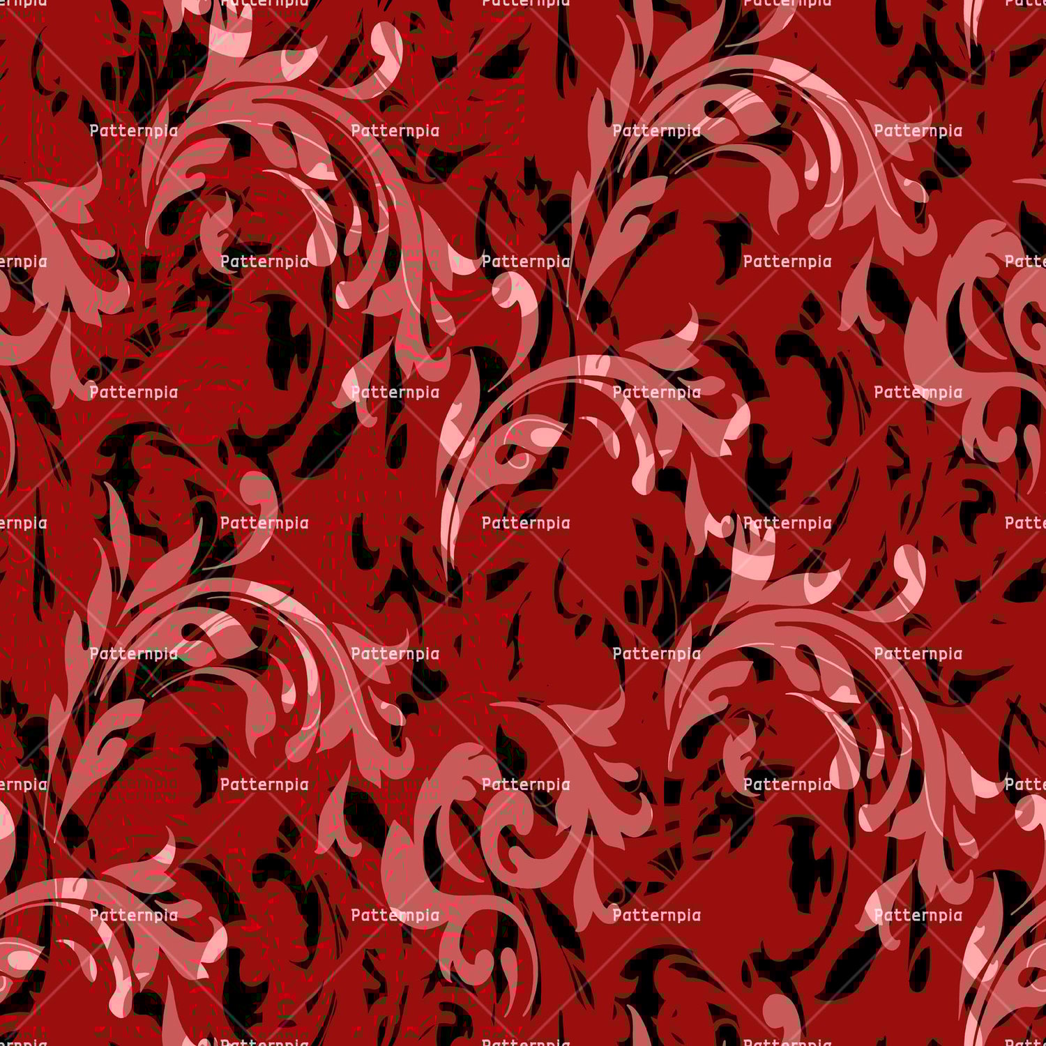 Intricate pink and red baroque scrolls with black silhouettes on crimson.