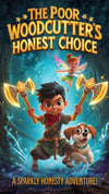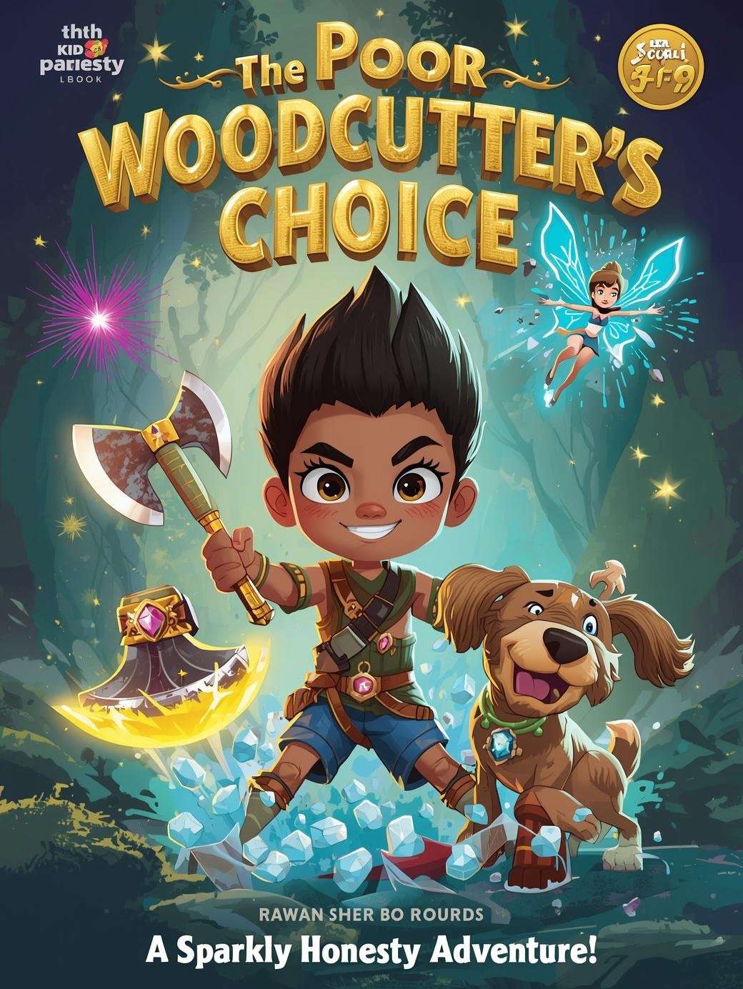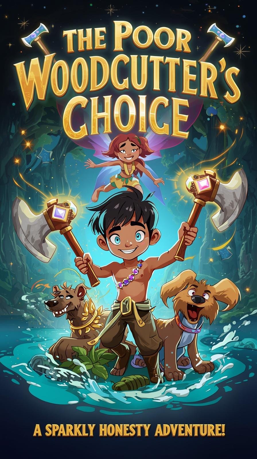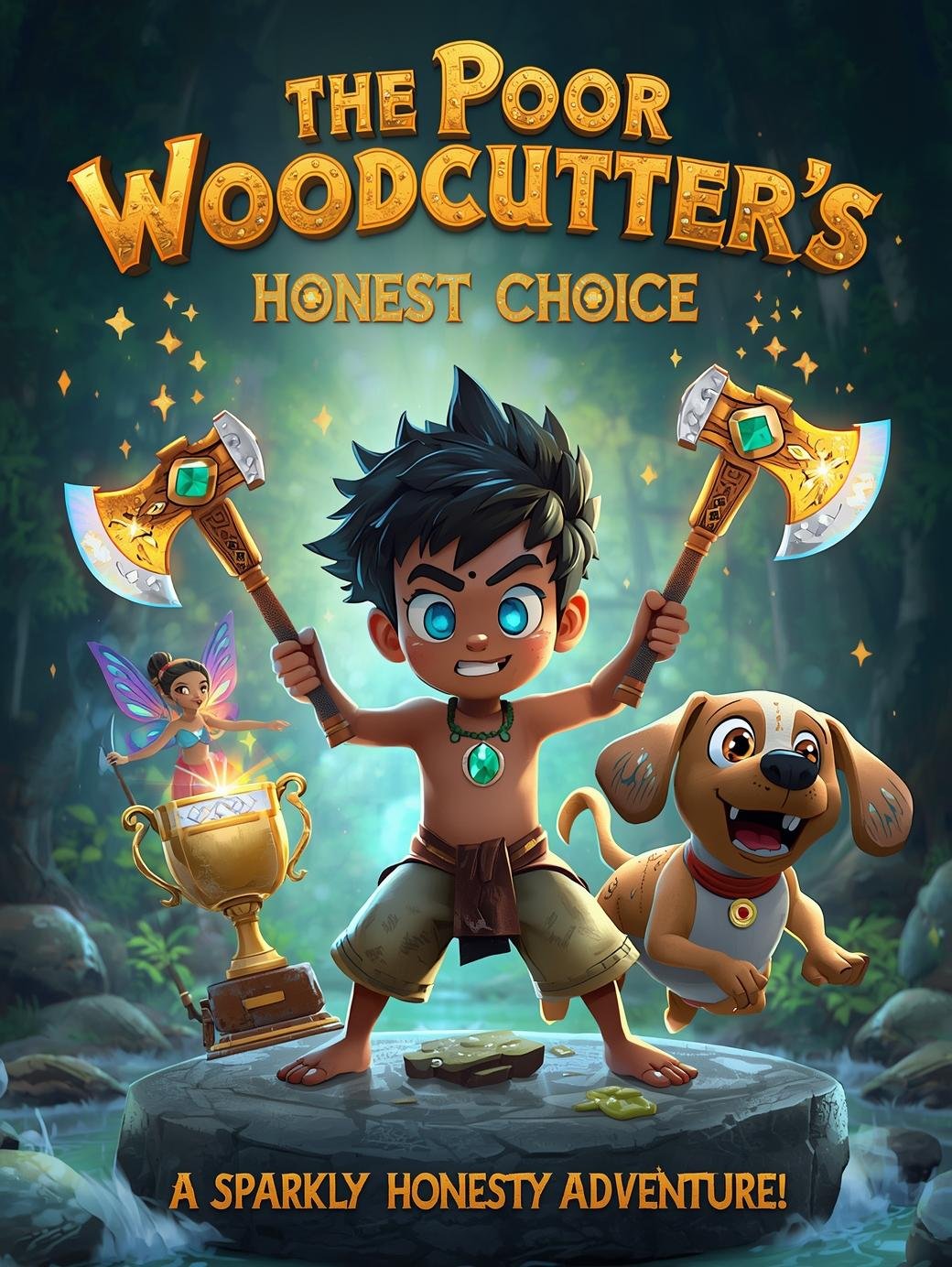 In a misty green forest, where tall trees whispered secrets to the wind, lived a poor woodcutter named Hari. Every day, before the sun peeked over the hills, he swung his old axe, chopping wood to sell in the nearby village. His hands were rough like tree bark, his clothes patched and faded, but his heart shone brighter than gold. Hari had a little hut with a thatched roof that leaked in the rain, and he shared his simple meals of rice and wild berries with his loyal dog, Bhutu.