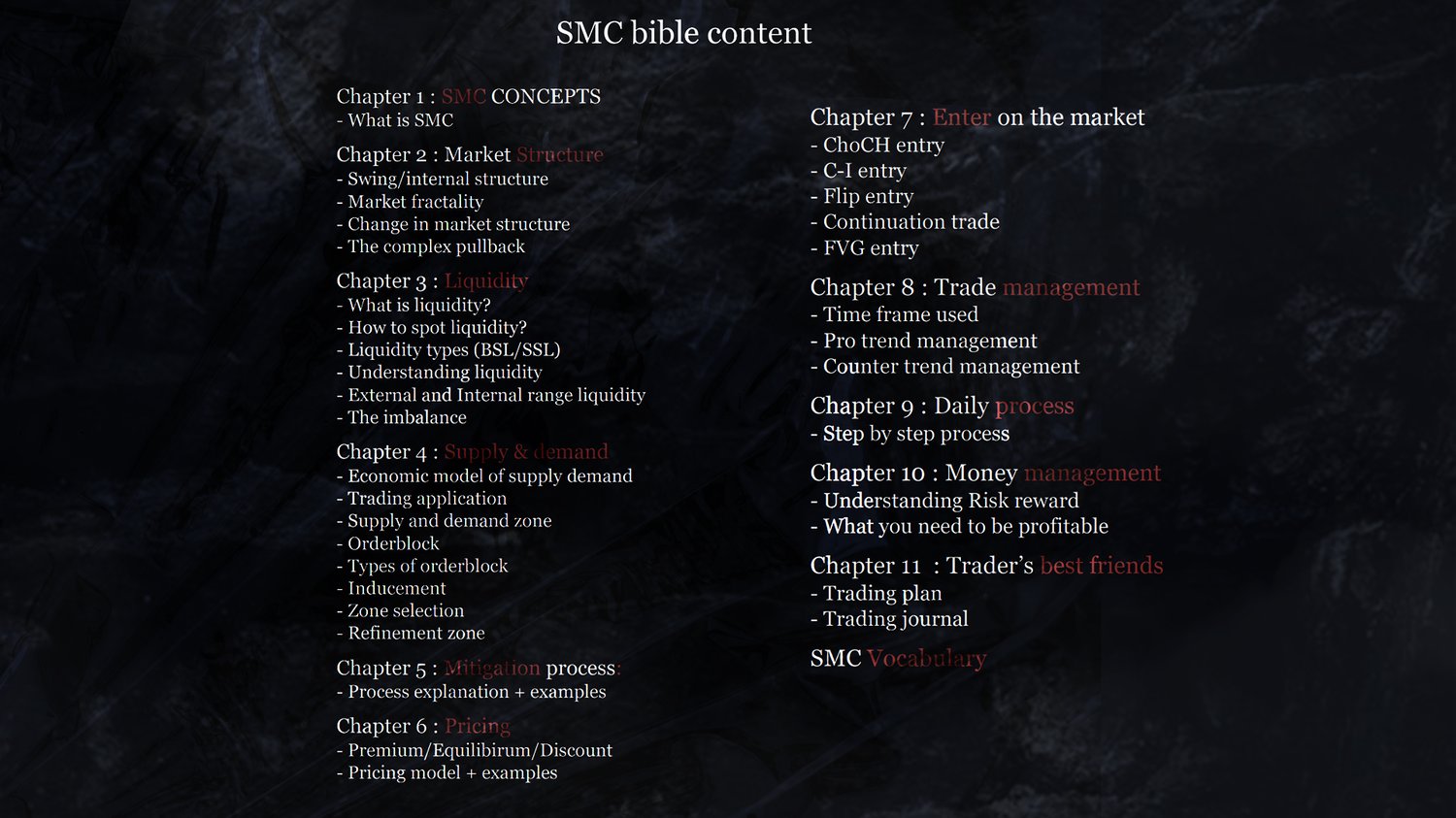 This book contains 106 pages and 12 chapters with all the SMC vocabulary and a trading plan template at the end of this book.