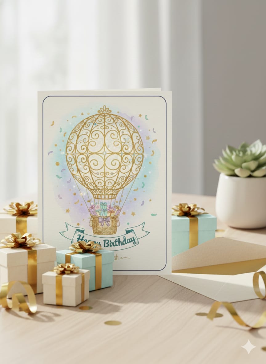 Send warm birthday wishes with this charming hot air balloon birthday card. Featuring soft watercolor tones, golden details, floating gifts, and the message “Make a Wish,” this design feels magical and joyful.