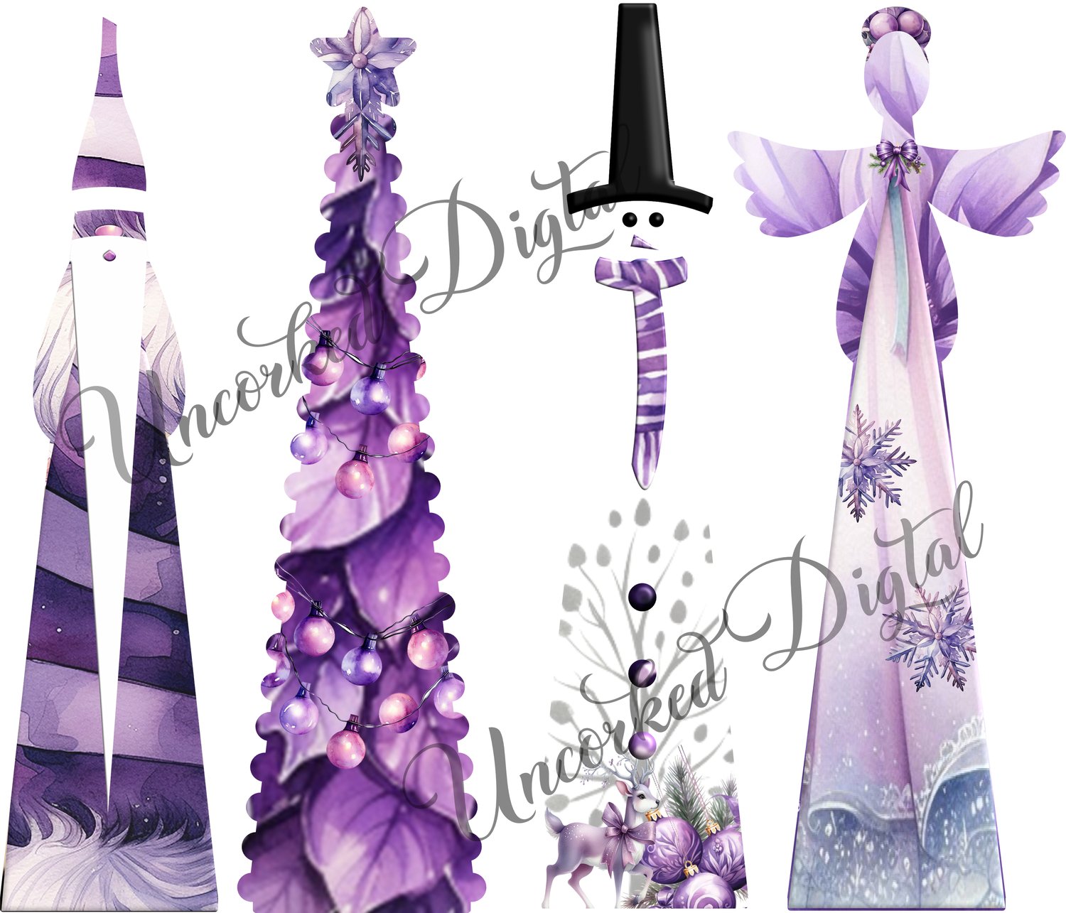 Set of Hanging and Freestanding Nordics in purple includes, Snaowman, santa, tree and angel. These fit the blanks from Woodform Crafts.