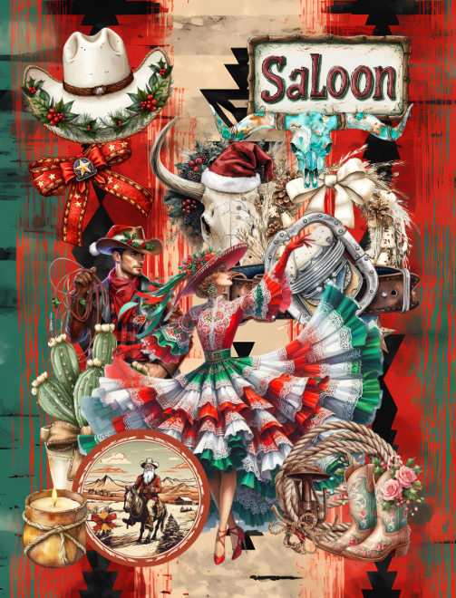 Pull out your scissors and glue and dive into the world of a western Christmas with this artistically beautiful cut and collage book. Images feature cowboys, western Santa Claus, cowboy hats, deer, snowmen, horseshoe, blankets, houses, beautiful women, cacti, ornaments, wheel, leather vest, doors, wreaths, seating for comfy times, covered wagons, boots, cow, riding saddles, Christmas trees, Santa Claus riding horses, barns, dog, snow globes, guitars and much more. All images are western cowboy themed for the Christmas holiday and absolutely adorable.