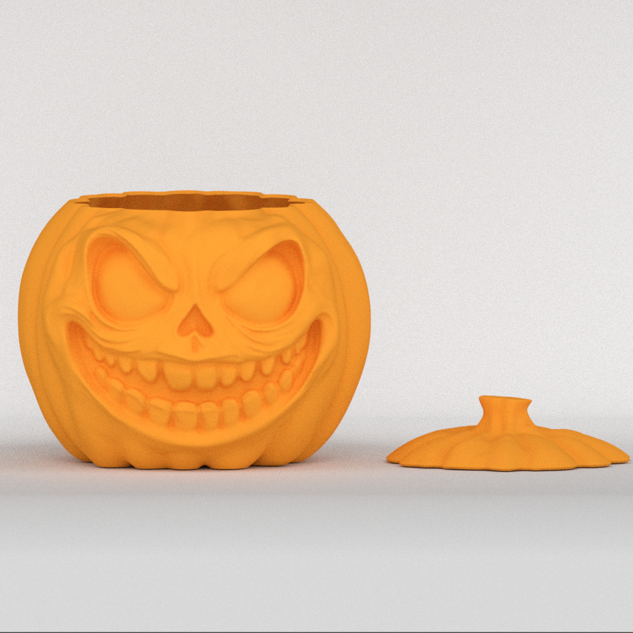 Little jack-o'-lantern, made for 3d printing. It's something like 11 cm in width (4.3 in). I included the non-sliced version too and two versions of the lid, one completely flat, the other carved out.
