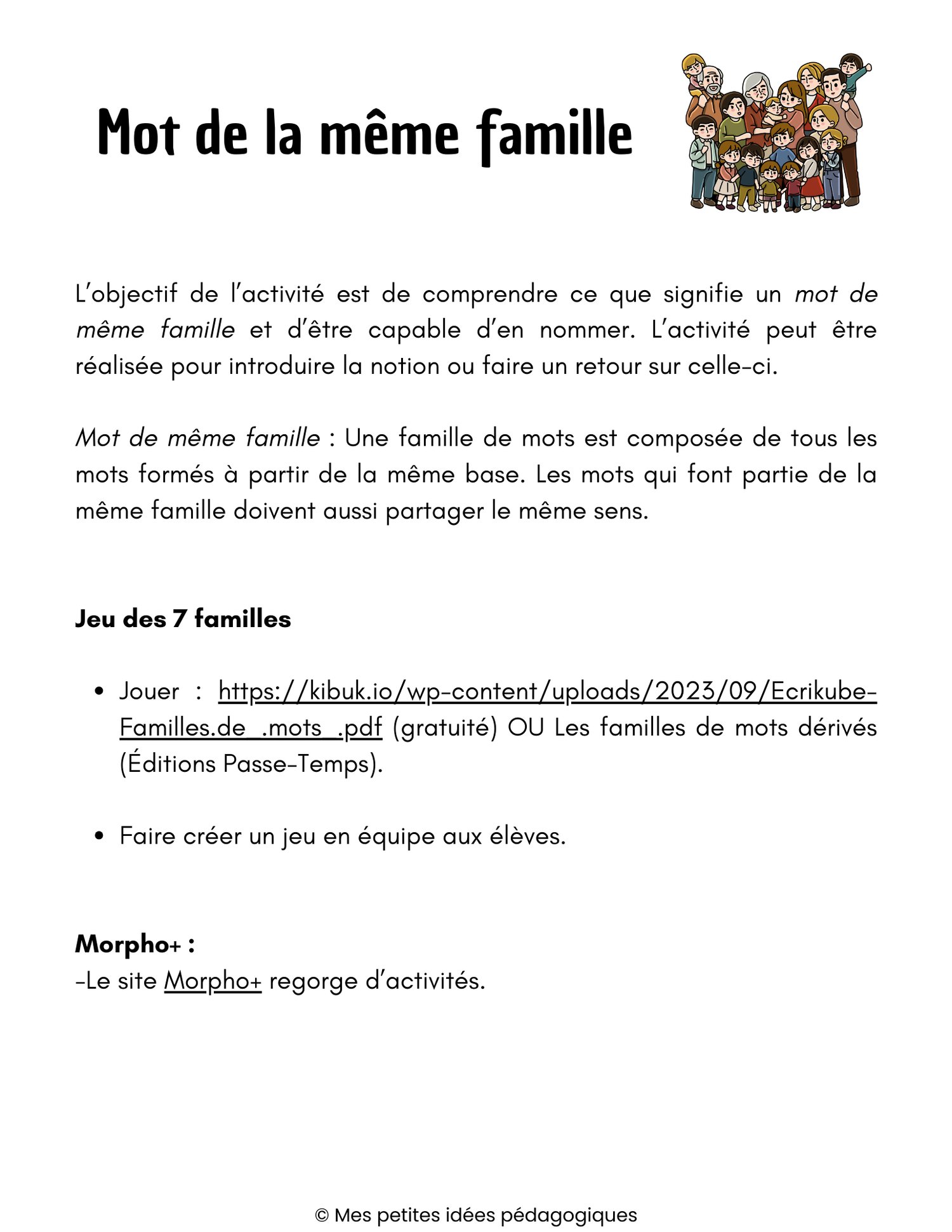 L’objectif de l’activité est de comprendre ce que signifie un mot de même famille et d’être capable d’en nommer. L’activité peut être réalisée pour introduire la notion ou faire un retour sur celle-ci.
