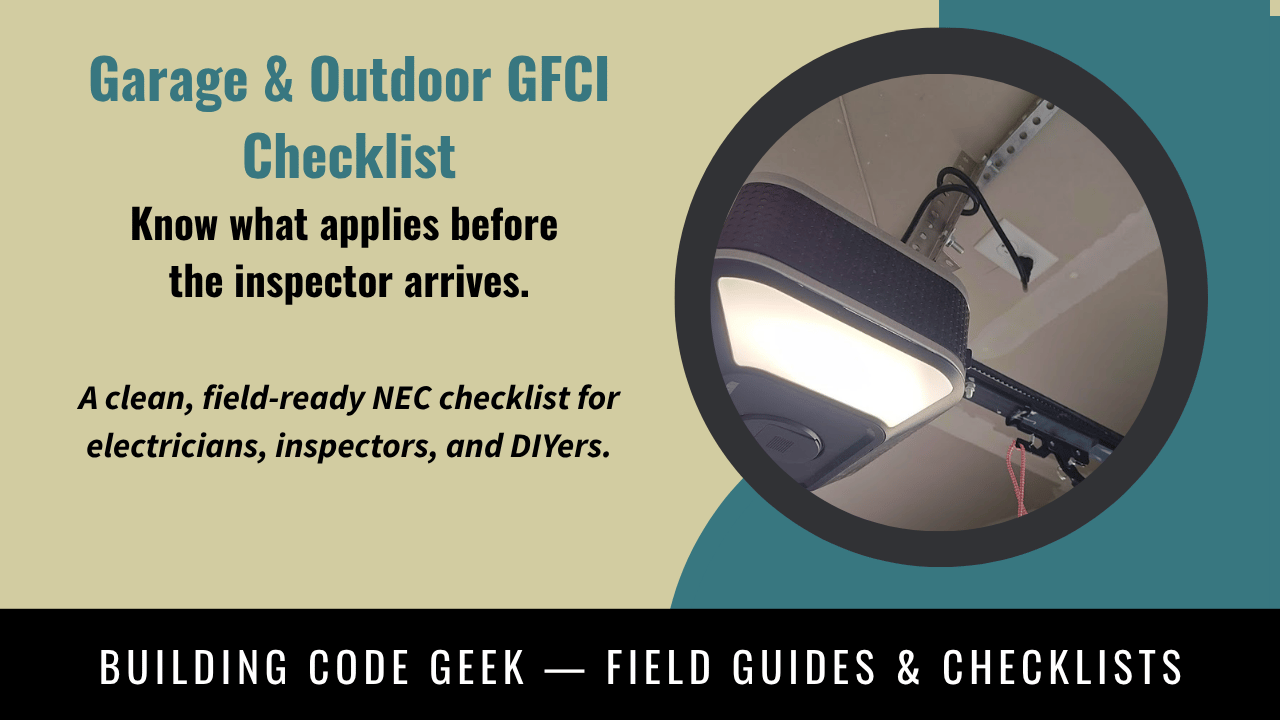 This field-ready checklist breaks down the GFCI requirements that are most often misapplied in garages and outdoor installations, including receptacle vs outlet rules, accessibility requirements, service receptacles, and real inspection failures.