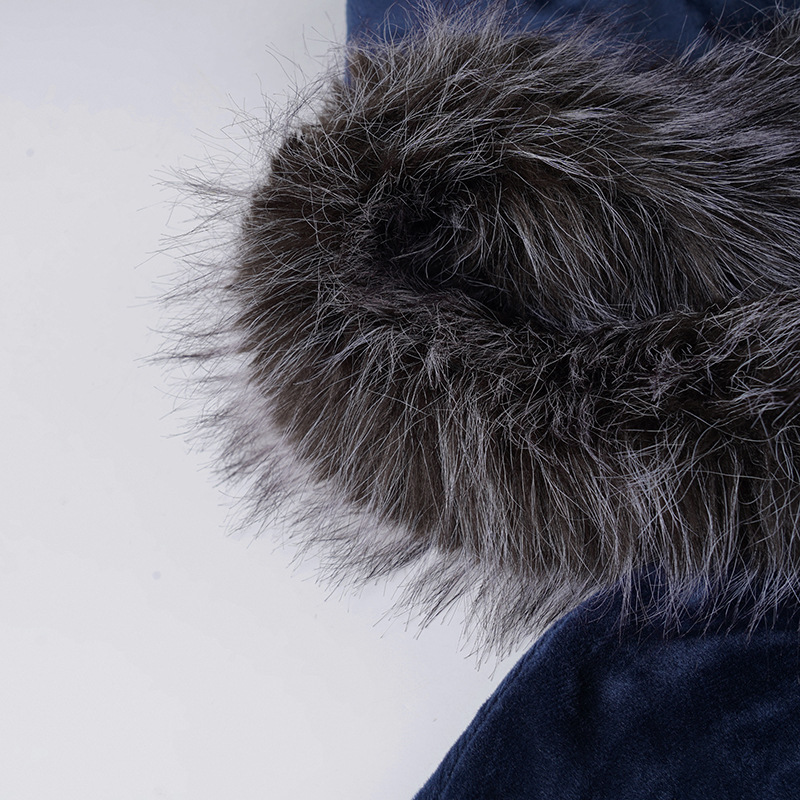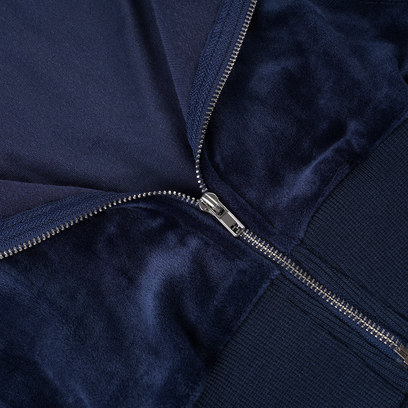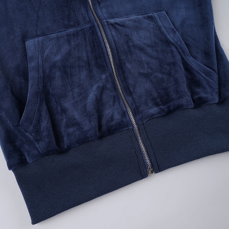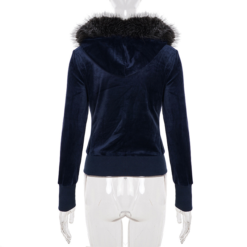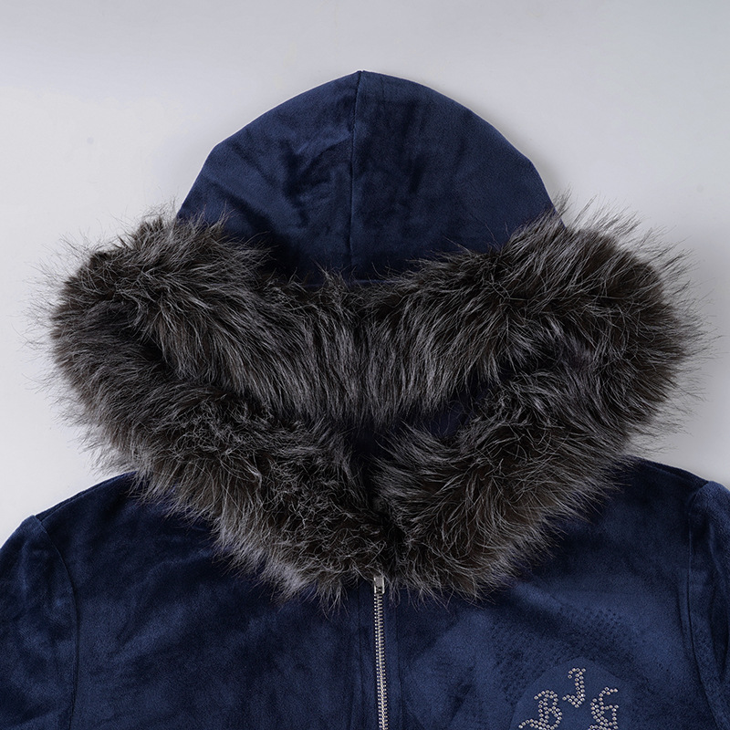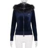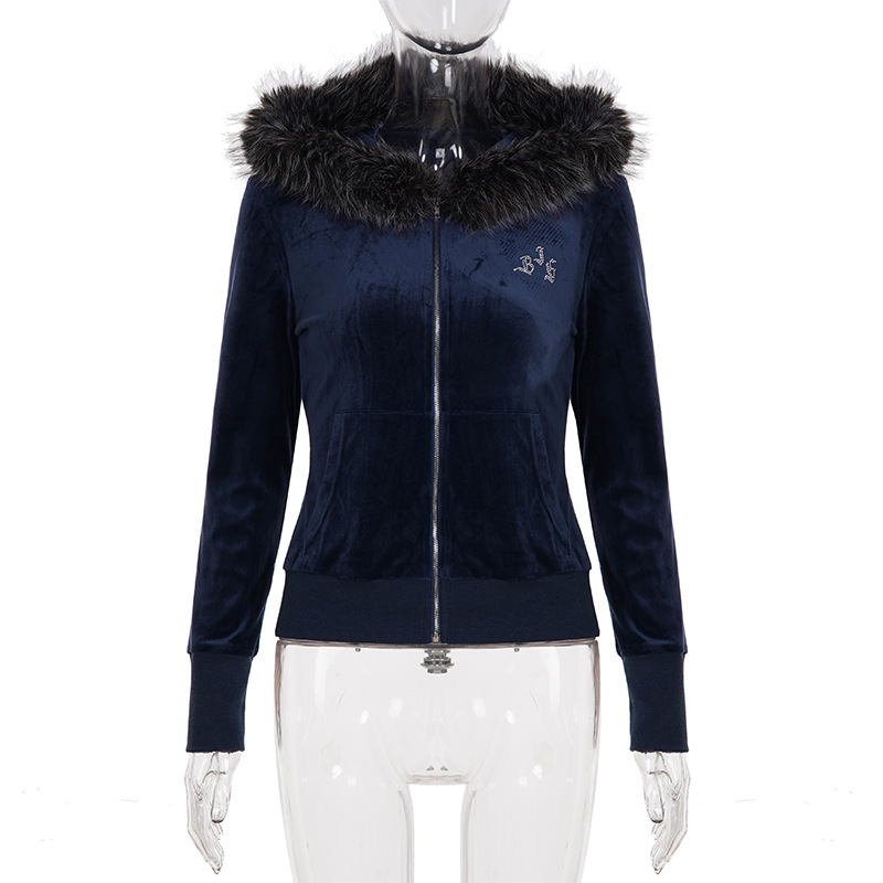 Y2K retro letter embroidery velvet dark blue slim fur hoodie zip-up sweatshirt