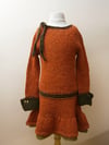 The absolute bees knees for twirling, the cat’s pyjamas for dancing about.This twenties-inspired little dress has great movement and life due to the full, double-ruffled skirt and a relaxed gauge in an aran yarn. It features the classic dropped waist of the flapper dress and ties at the neck which can be left untied or made into a bow for the vintage 20’s look.