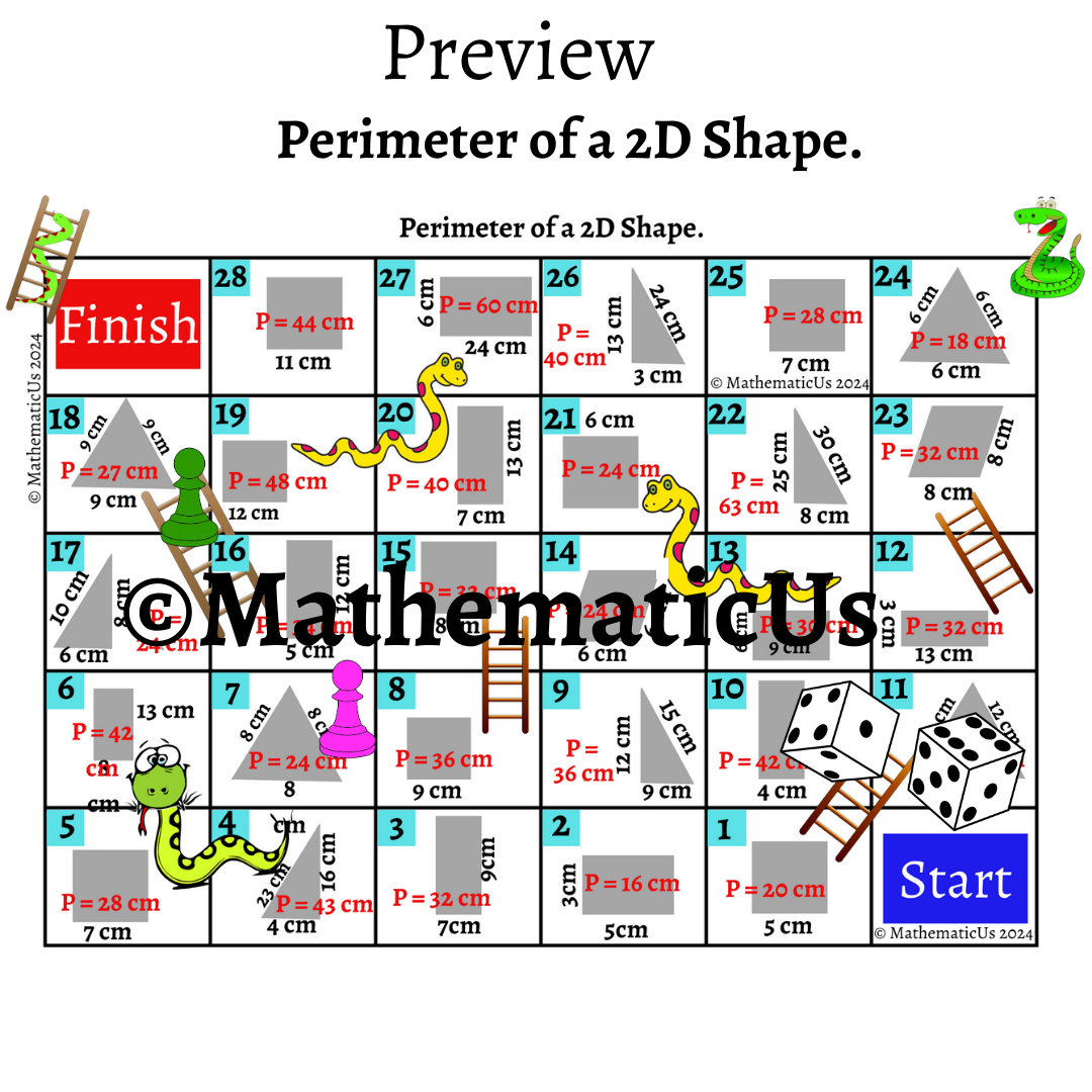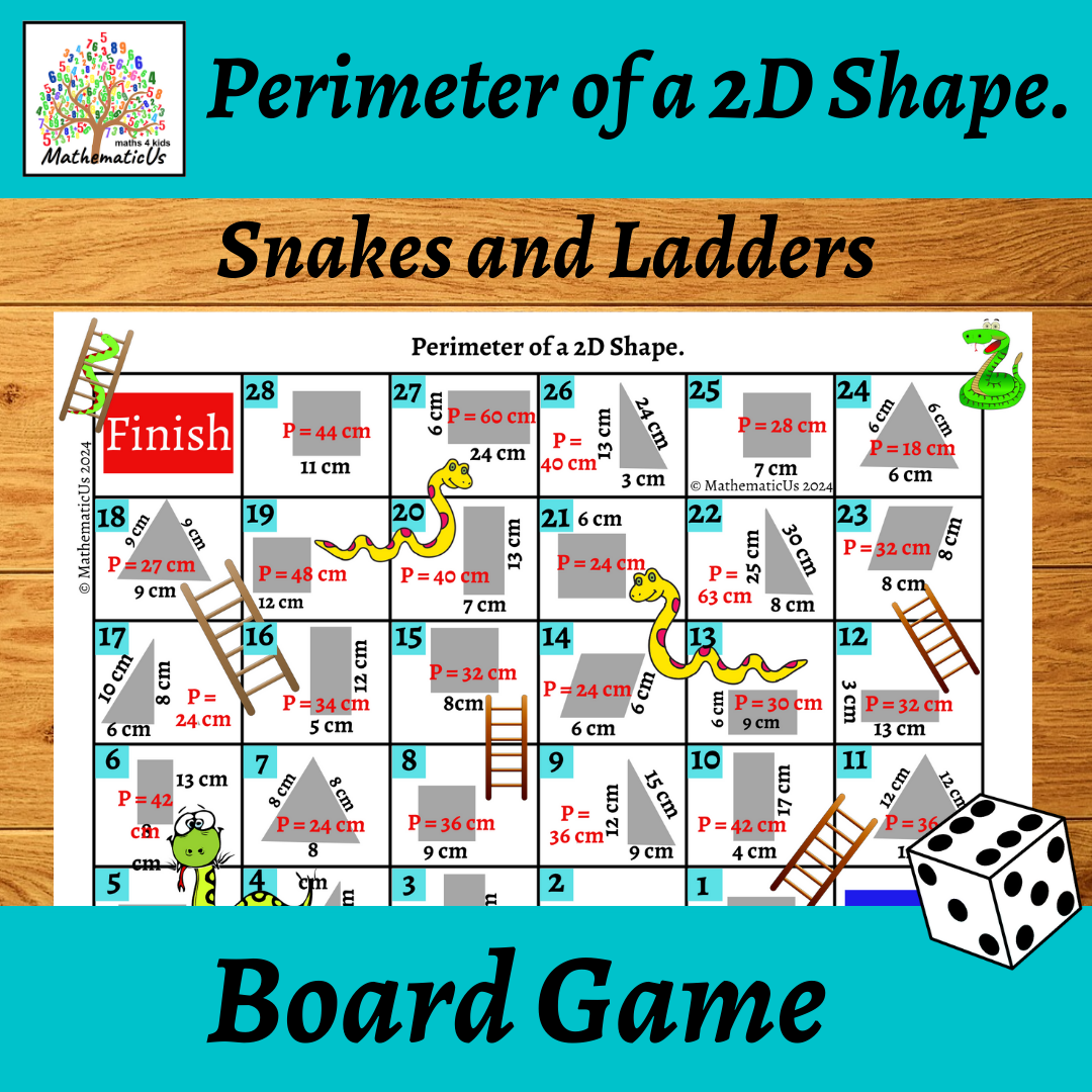 The board game is a Snakes and Ladders game. Children will count a perimeter of rectangle, square and triangle. This math game is a great review and an engaging way to practice more in Finding a Perimeter of a 2D shape. Children will have fun playing this dice game.