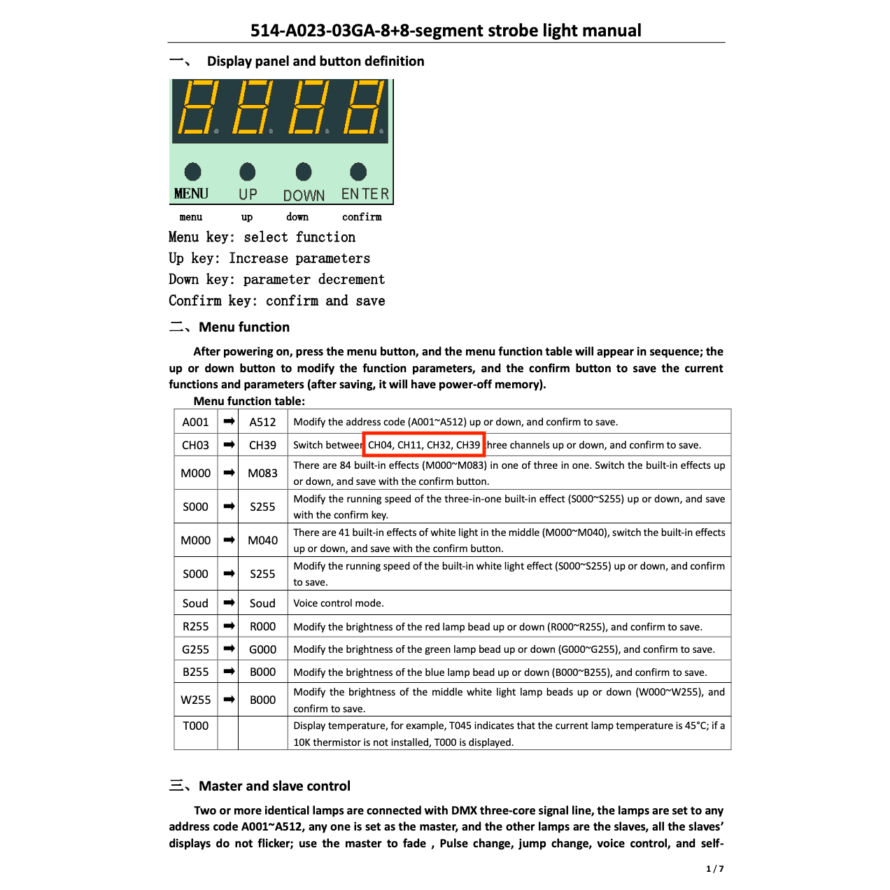 * En el modo CH11 verifique, con un Fixture de pruebas (click), que coincidan estos canales: 1 Dimmer, 7 Azul, 2 Strobo.