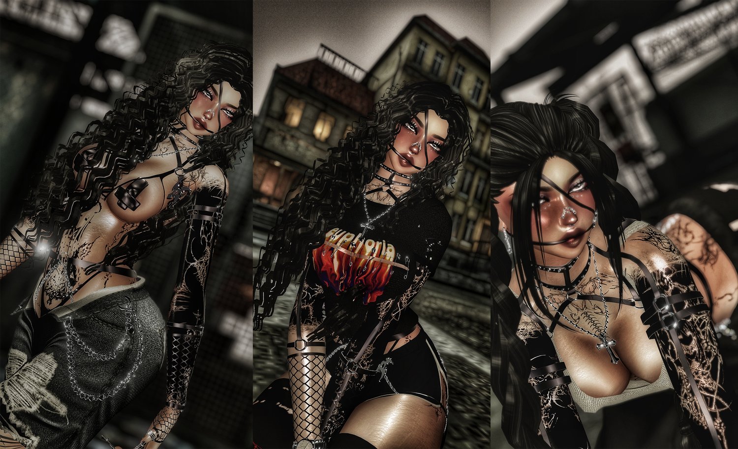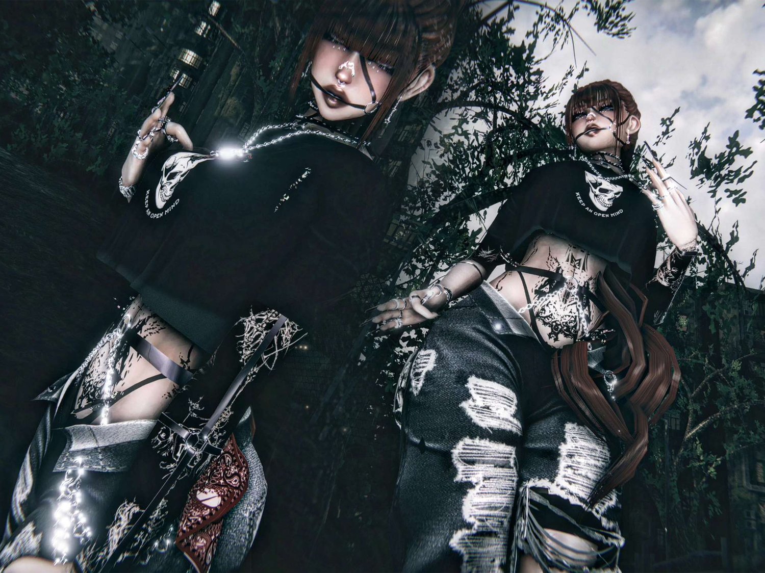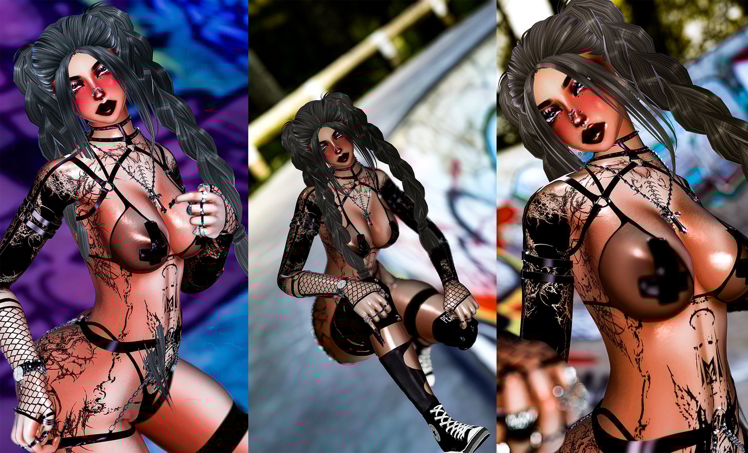 ponytail and braids(@Nessy!), rings(@DaddyIssuezvrc), nails(@ana0420), panties, shorts, arm harness(@cryptcandy), gloves(@alexis70), blades(@milkymutt#6666), jeans and curls(@saikura), tshirt(@vinuzhka#0881), necklace, knee bandana and socks(@nauuki), tank, harness, face harness, nose piercing(@weeeby) pasties(@Blushedtofu#6452), bandana(@hayweee), cropped top(@QueenAnarya), bra(@winxie.)