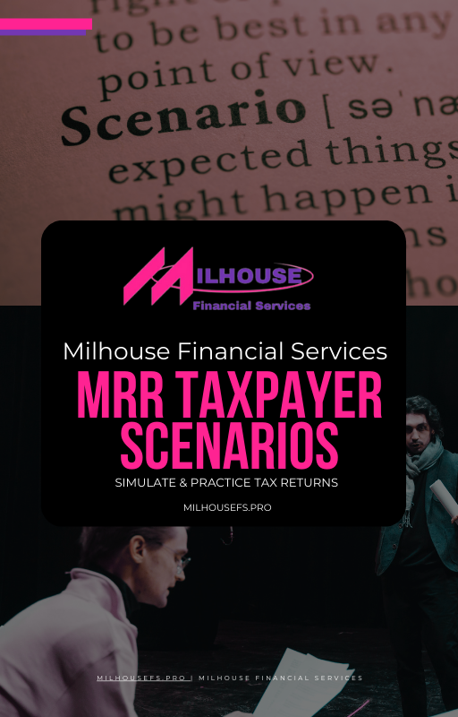 MRR Taxpayer Scenarios is a comprehensive resource designed to help tax professionals navigate real-world tax situations with confidence. This guide presents a variety of taxpayer scenarios—including self-employed individuals, families, small business owners, and investors—along with step-by-step solutions for determining deductions, credits, and compliance requirements. Perfect for both new and experienced tax preparers, this resource enhances problem-solving skills, improves accuracy, and prepares you for diverse client needs. Whether you're training staff or refining your expertise, MRR Taxpayer Scenarios is an essential tool for mastering complex tax cases and delivering top-notch service!