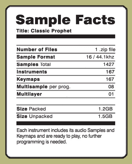 Based on the Prophet 5, this was the first popular polyphonic synth that took analog synthesis to the next level in the mid seventies. Capable to make a rich waveform palette, from warm pads to classic leads, strings and brass patches. The most usefull side of its classic sound as raw as possible. This machine is capable to make a truly unique sound despite its low popularity. This collection includes an outstanding set of patches available for the MPC family. Each instrument includes audio Samples and Keygroups. You can load these sounds straight into your MPC and you'll be ready to play the instruments, no further programming needed. This is a downloadable product. All instruments are multi-sample recorded at great quality in stereo with high end A/D converters. Every sample was smoothly looped to save sample memory and loading time. More than 1.4GB of audio data including the most characteristic sound sampled from the Classic Prophet 5.