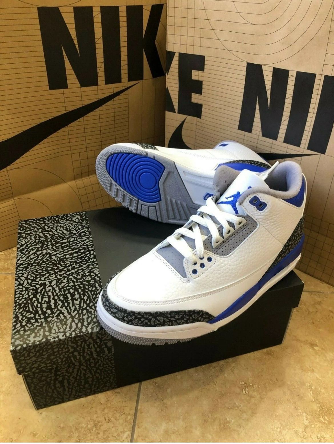 Air Jordan 3 Retro “Racer Blue” – Men’s Size 11 (2021 Release) Colorway: White / Racer Blue / Black Condition: Brand New / Deadstock 100% Authentic The Air Jordan 3 Retro Racer Blue (2021) delivers a timeless Jordan silhouette with a clean white leather upper and bold Racer Blue accents. Featuring the iconic elephant print, visible Air cushioning, and premium construction, this pair is a must-have for collectors and everyday wear. Details: • Men’s Size 11 (US) • High-quality leather upper • Classic elephant print overlays • Visible Air unit for comfort • Durable rubber outsole for traction • 2021 official release Why This Pair Sells: • Popular Jordan 3 model • Clean, wearable colorway • Brand new, never worn • Harder to find in deadstock condition 📦 Ships fast and securely ✔️ Smoke-free, pet-free storage ✔️ Authenticity guaranteed Perfect for Jordan collectors, rotation wear, or long-term hold. Buy with confidence — clean pairs don’t sit long. $350