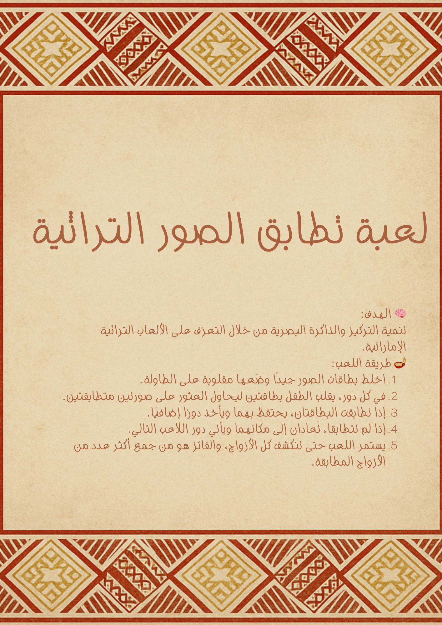 يطابق الأطفال بين الصور ليتعرّفوا على ألعاب الإمارات القديمة بطريقة شيقة تنمّي التركيز والذاكرة. 🌾✨