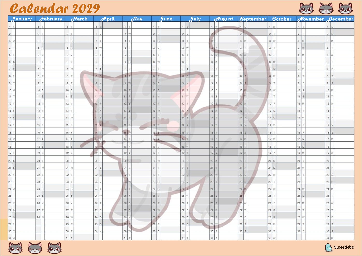 Cute Kitty Design 2029 Single Page Yearly Calendar Planner (Printable & PDF)