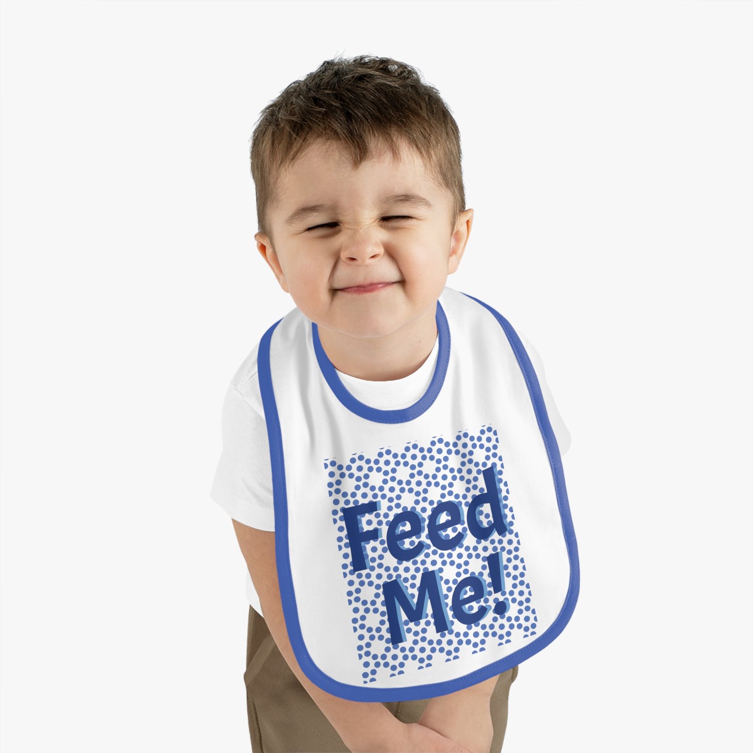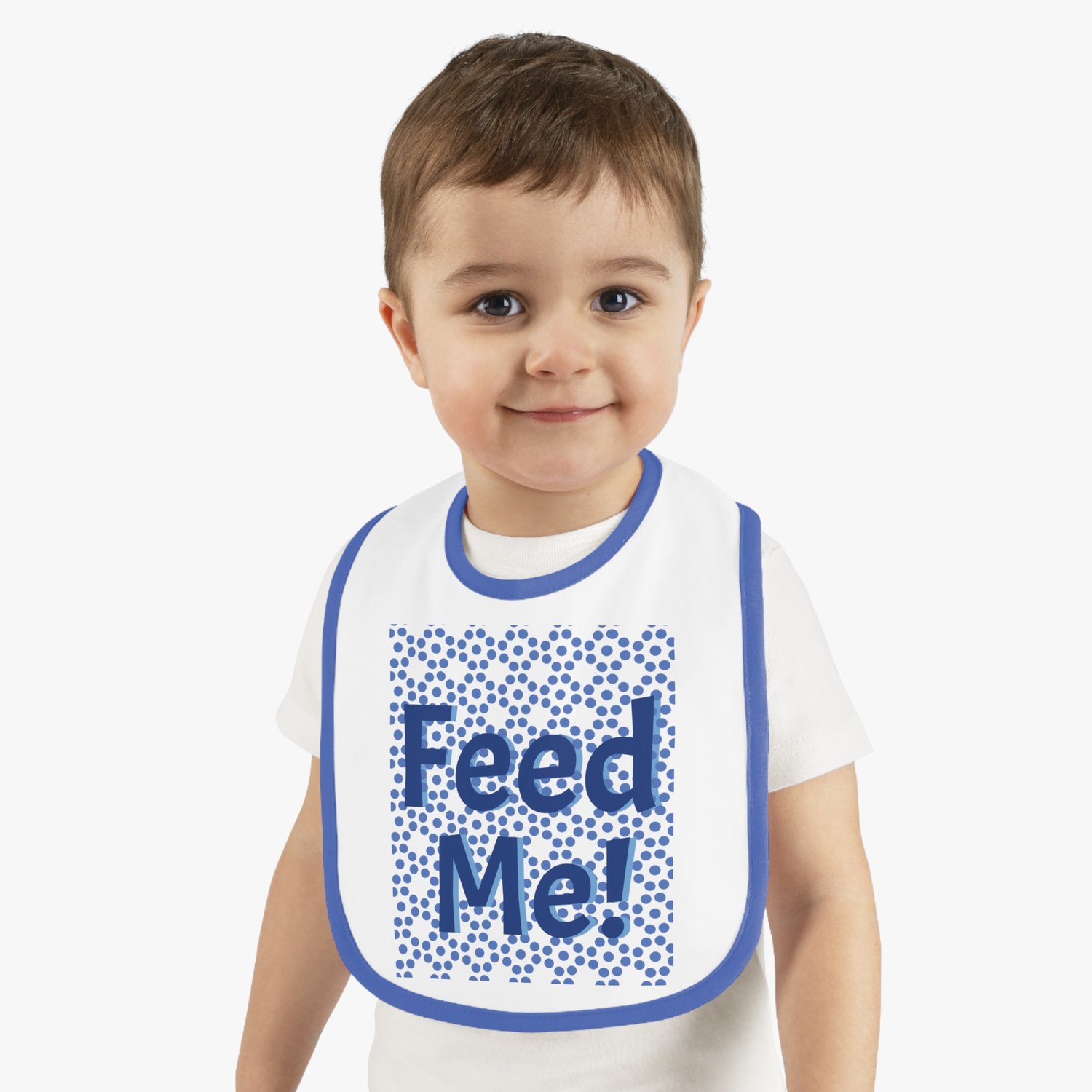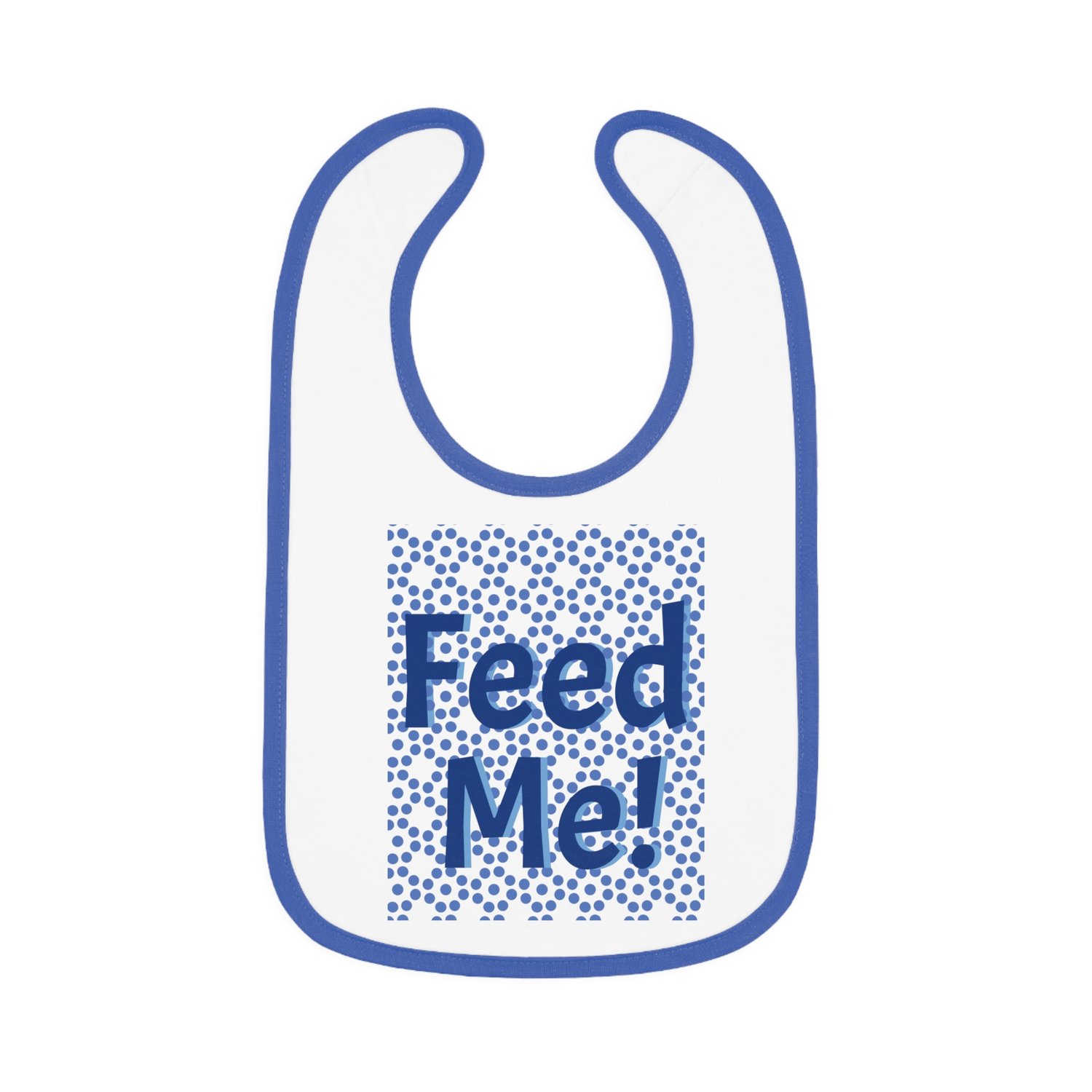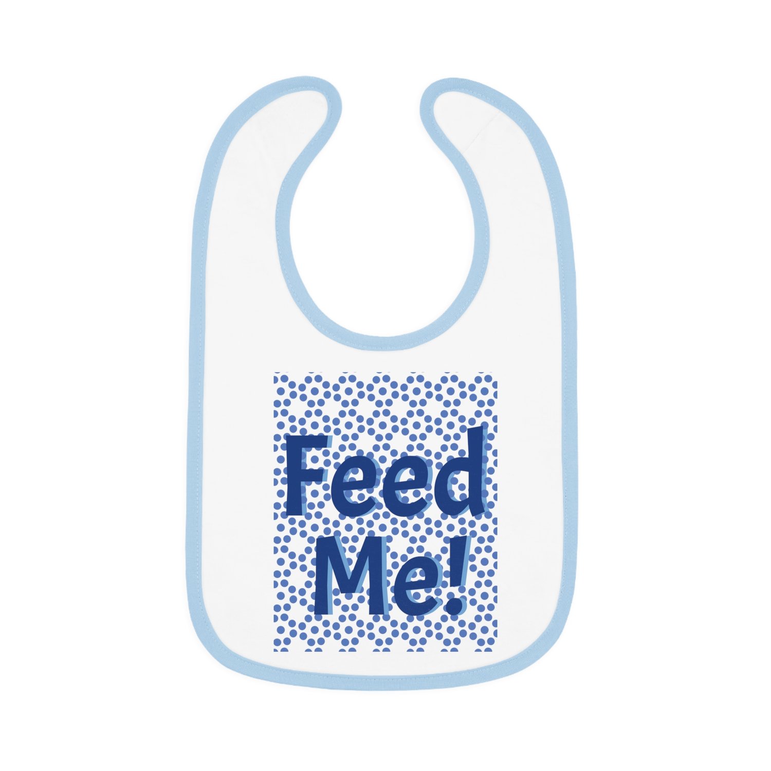 Introducing the perfect blend of functionality and style with our adorable baby bib! This cheerful bib features a playful 'Feed Me!' design that adds a fun touch to mealtime. Made from soft, 100% combed and ringspun cotton, it ensures your little one stays clean and comfortable while enjoying their favorite foods. The vibrant contrast trim not only looks great but also enhances durability.\n\nIdeal for infants and toddlers, this bib is perfect for parents who want to keep their child stylish while protecting clothing from spills. It makes an excellent gift for baby showers, birthdays, and holidays such as Christmas and Easter. With its practical velcro closure and easy to clean fabric, mealtime messes become a breeze! Bring joy to your daily routines with this charming bib that’s as fun as it is functional!