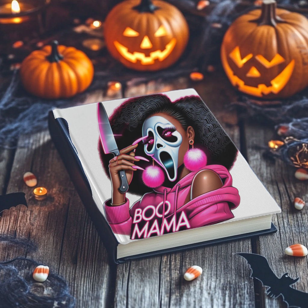 Add some bold spooky fun to your Halloween crafts with this Boo Mama digital design 🎃👻. Featuring an Afro queen in a pink hoodie, scream mask, and knife detail, this artwork is perfect for sublimation projects like shirts, clack fans, mugs, tumblers, and Halloween party decor.