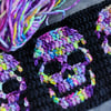Pattern includes 2 charts, the original full skull, and a no-jaw version. The pattern also includes instructions for creating pillows, and a cell phone bag. You can also use the charts to create anything from blankets to bags, placemats, wall-art, clothes and more! Great for Halloween and for those who like skulls around year-round!