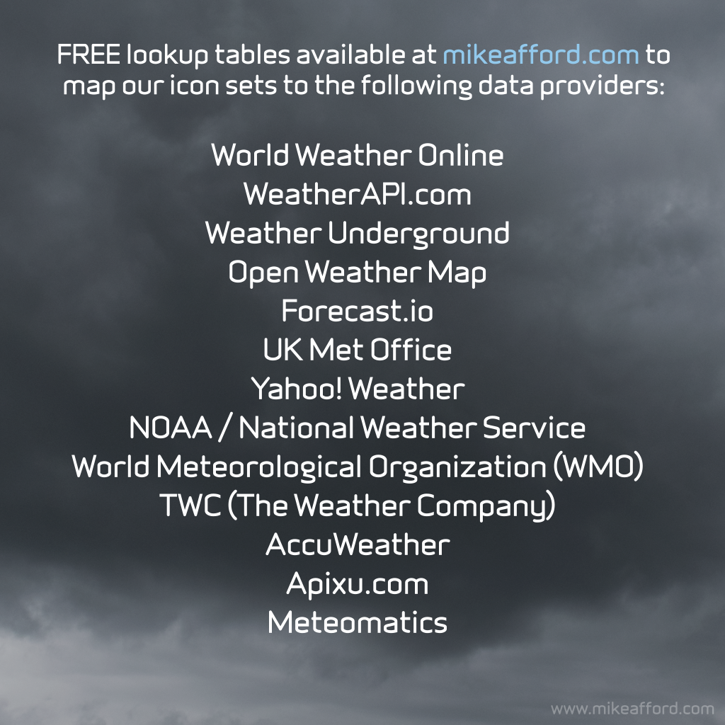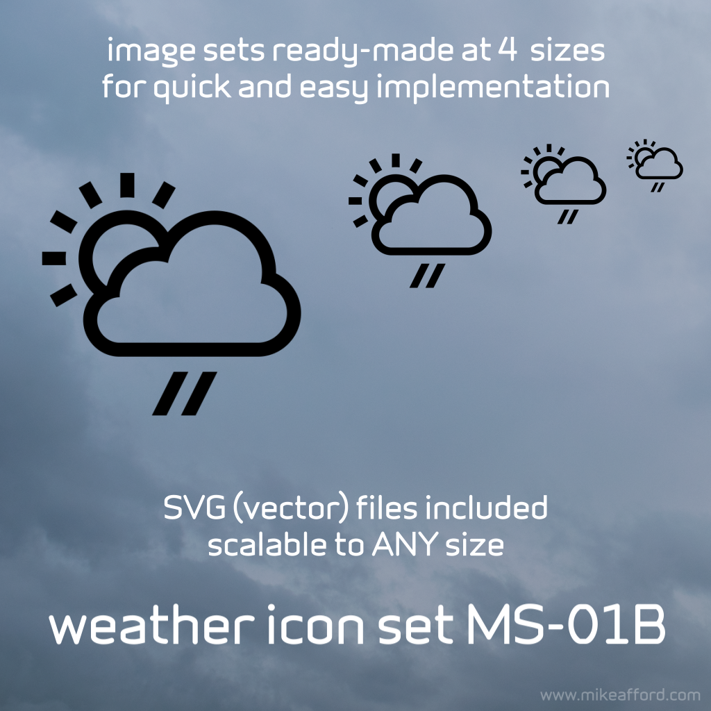 Ready-made at four different sizes for quick and easy implementation. You also get the complete set in vector format (SVG) – scalable to any size. 92 weather conditions in total (see list below).
