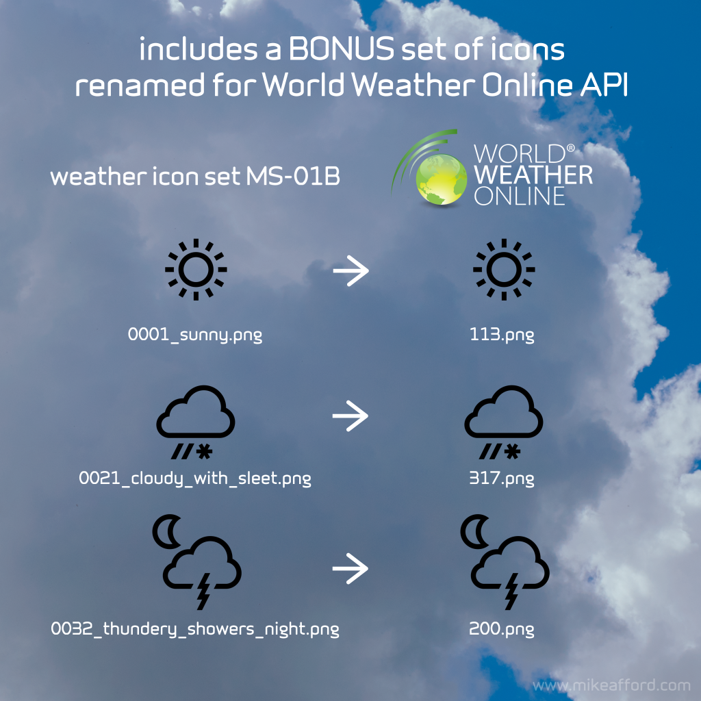 Also included in this pack is a special bonus set especially for World Weather Online API users with every icon for day and night correctly assigned and filenamed according to the original WWO condition code number eg. 284.png (= heavy freezing drizzle).