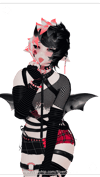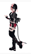 Accessories: Harness, Coffin bag, Choker, necklace, Bracelets, horn-chains, earring, lip and nose piercing, thigh garters.