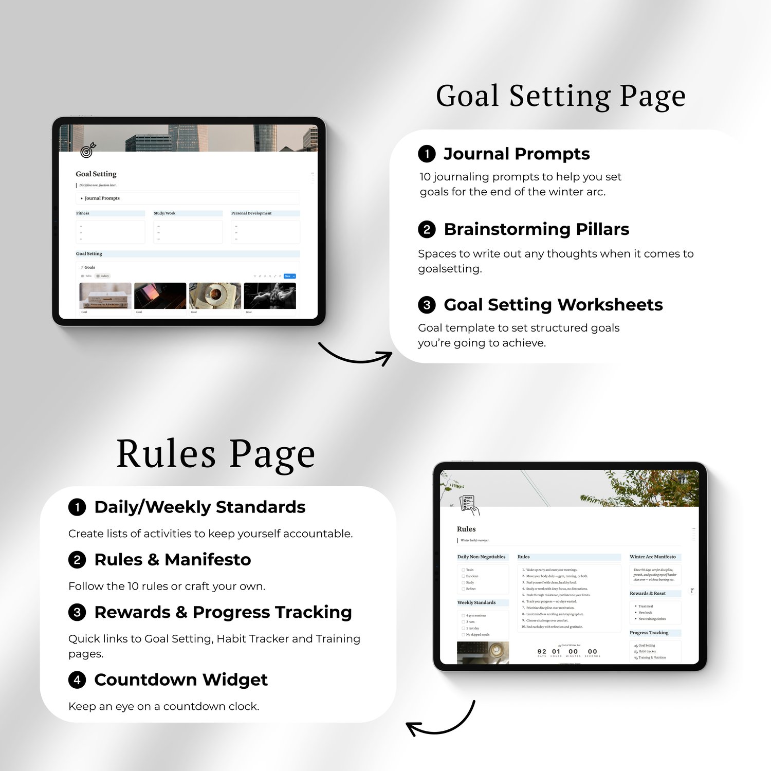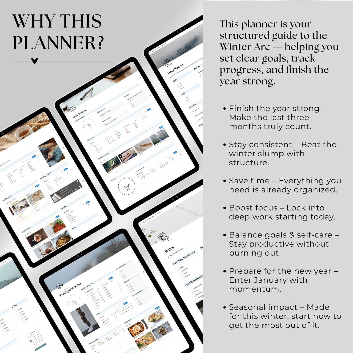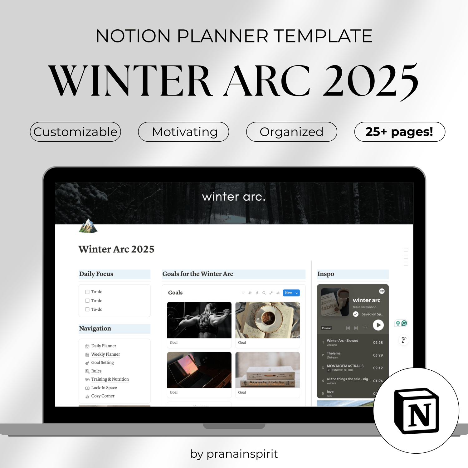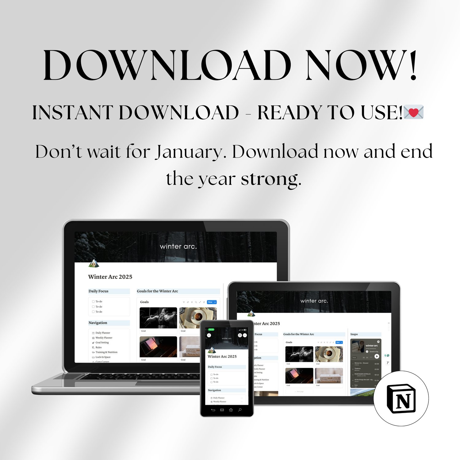 Keywords: Notion template, Notion planner, Winter Arc 2025, seasonal Notion template, digital planner, productivity system, goal planner, Notion dashboard, cozy Notion template, winter planning, mindful productivity, seasonal goal setting, Notion habit tracker, aesthetic Notion template, self-care planner, reflection journal, Notion life planner, focus and growth planner, Notion templates for students, Notion templates for productivity, seasonal routines planner, Notion goals and habits, cozy digital planner