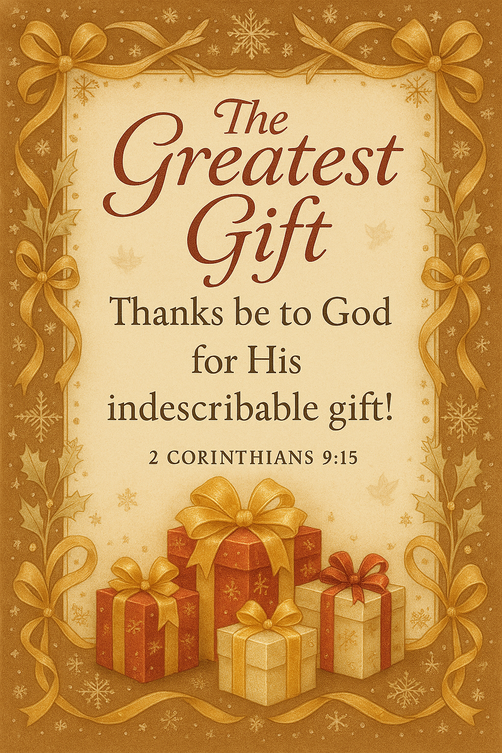 Celebrate the divine generosity of the season with this Christian wall art featuring 2 Corinthians 9:15. A radiant holiday design with golden ribbons, stars, and snowflakes frames five beautifully wrapped gift boxes, symbolizing the spiritual and material blessings of Christmas. This printable honors the indescribable gift of God—perfect for Christmas scripture decor, ministry bundles, devotional gifts, and inspirational holiday printables.