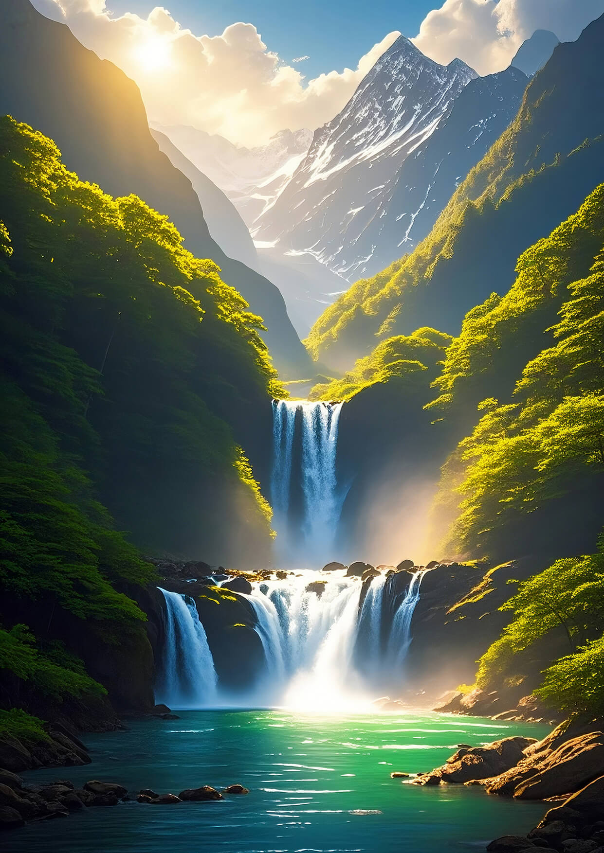 This digital artwork will boost your career luck through the Feng Shui elements of blue, mountains, waterfalls, and light.
