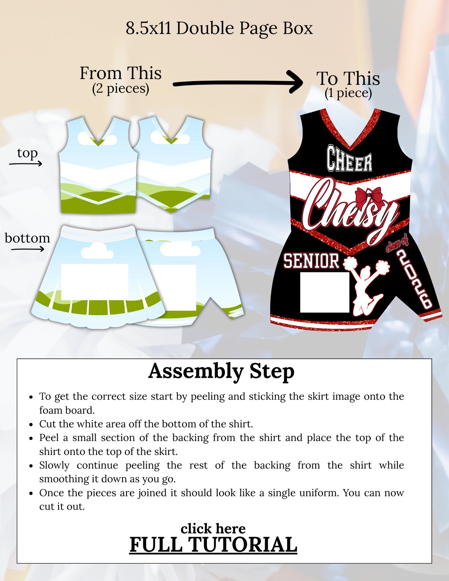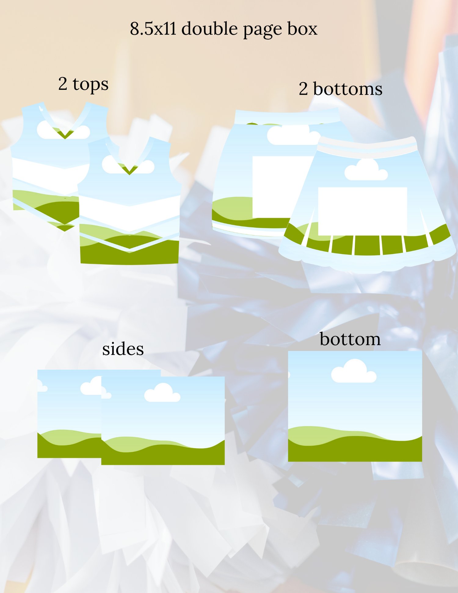 This bundle includes two cheer uniform styles and three different box sizes so you can create the perfect fit for any treat or small gift. The 8.5x11 size includes two layout options to give you even more flexibility when designing.