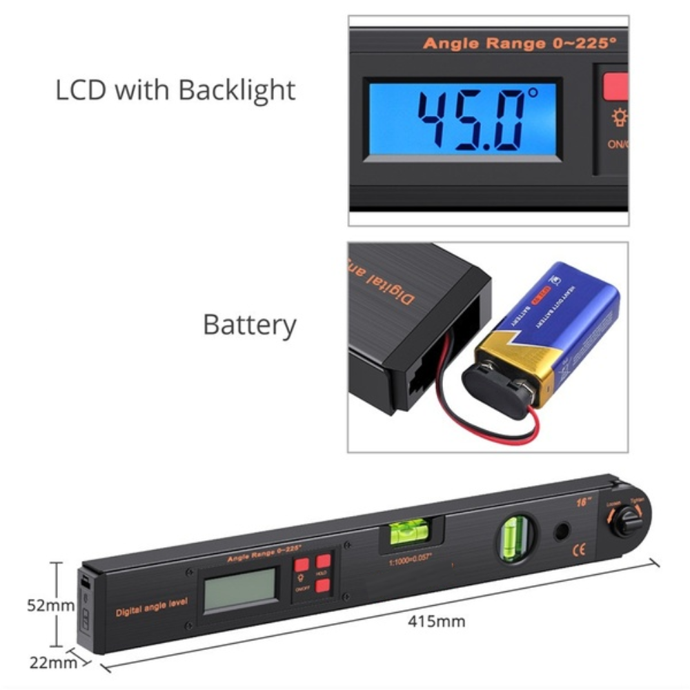 With 0-230° of measuring range, 0.1° of increment, ±0.5°(9mm/m) of accuracy, allow you to measure angle precisely and quickly.