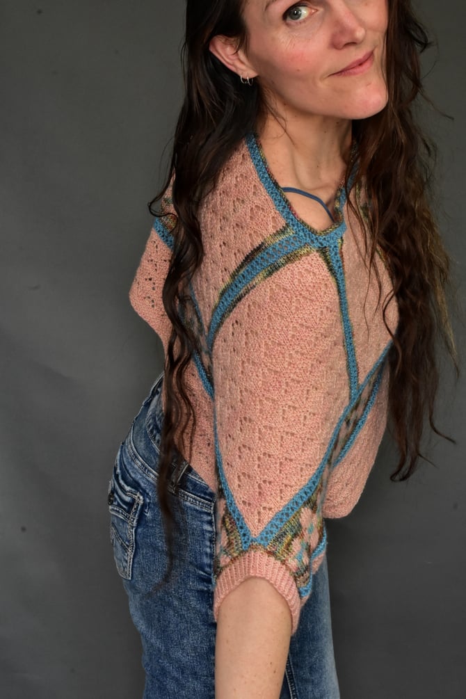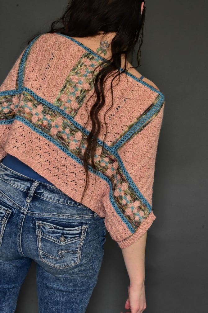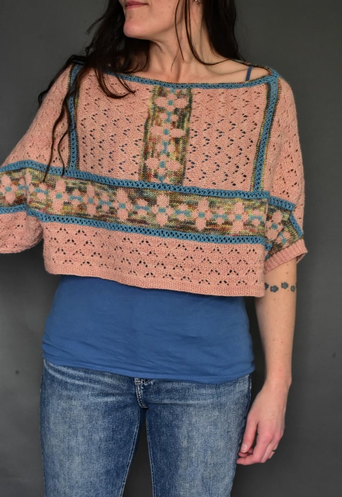 A modular and cropped dolman, sporting a very quirky and unique construction. At first, you may feel that you are knittng a beach towel, but then adding in some perpendicular directions, folding, and grafting, the sweater begins to take shape. It is worked top down; the yoke is worked sideways to the stranded band across the wingspan where the remaining sweater is worked down to the hem. It’s a great layering piece over a tank top or summer dress, if you need a snuggly layer of warmth!