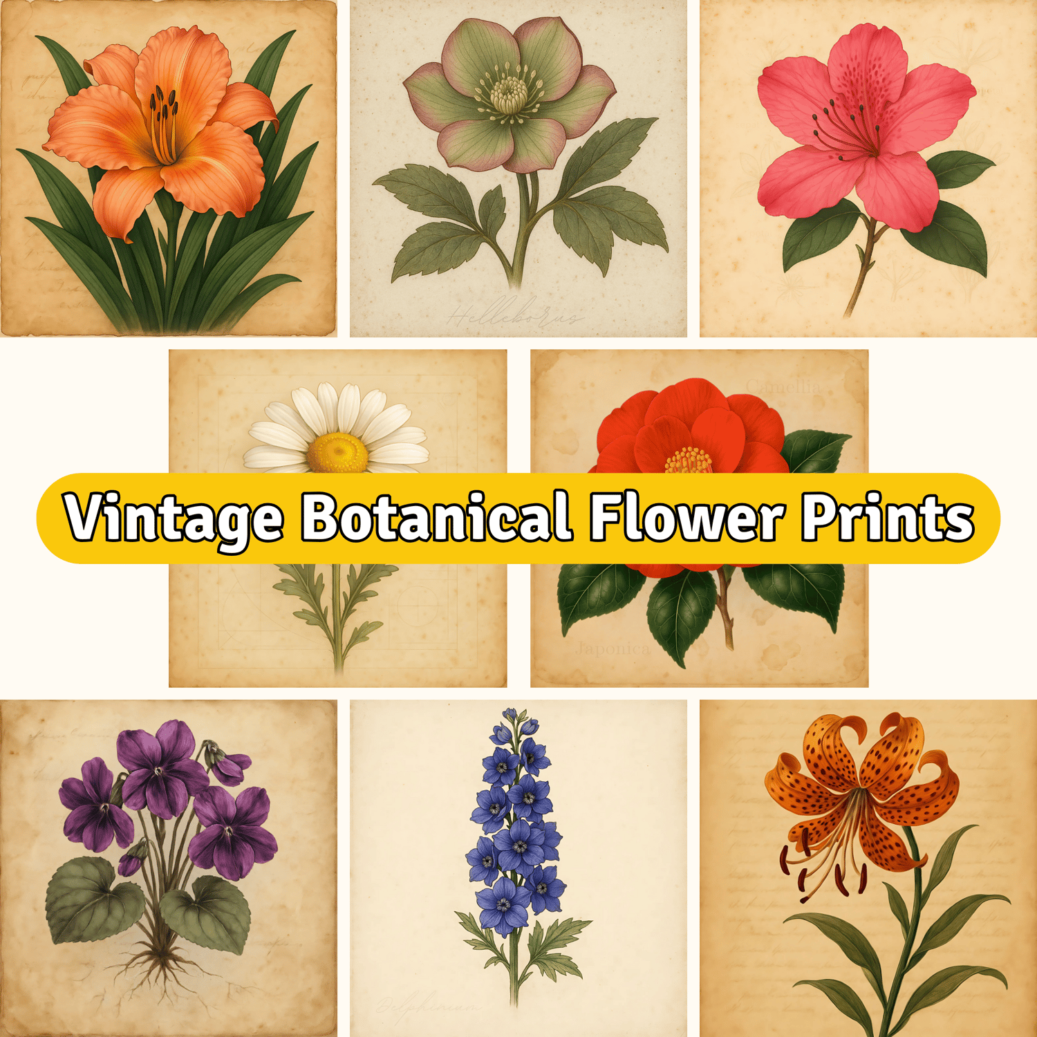 This set of 15 antique-style floral illustrations captures the romantic beauty of classic botanical prints. Featuring richly colored blooms such as tiger lilies, hydrangeas, and camellias, each design is layered over softly distressed paper with vintage textures, aged script, and faint botanical markings.