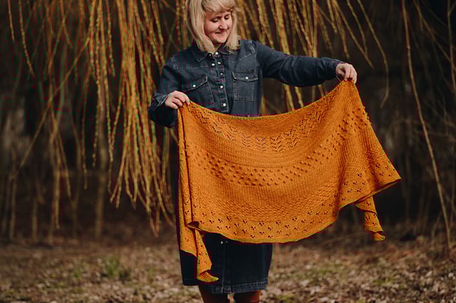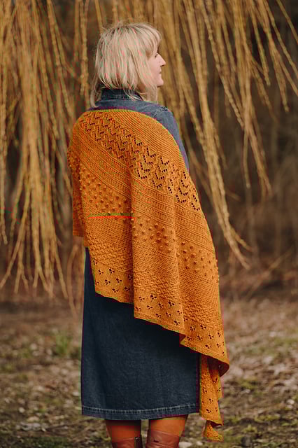 The shawl begins at the top center and is worked outwards to the border. There are two yarn-over increases in every row which create a long banana-like shape. The shawl is worked in sections, each featuring a different texture or lace stitch pattern.