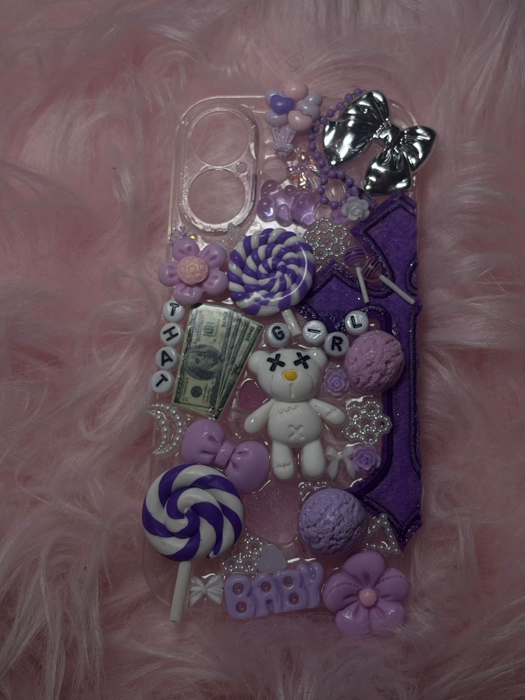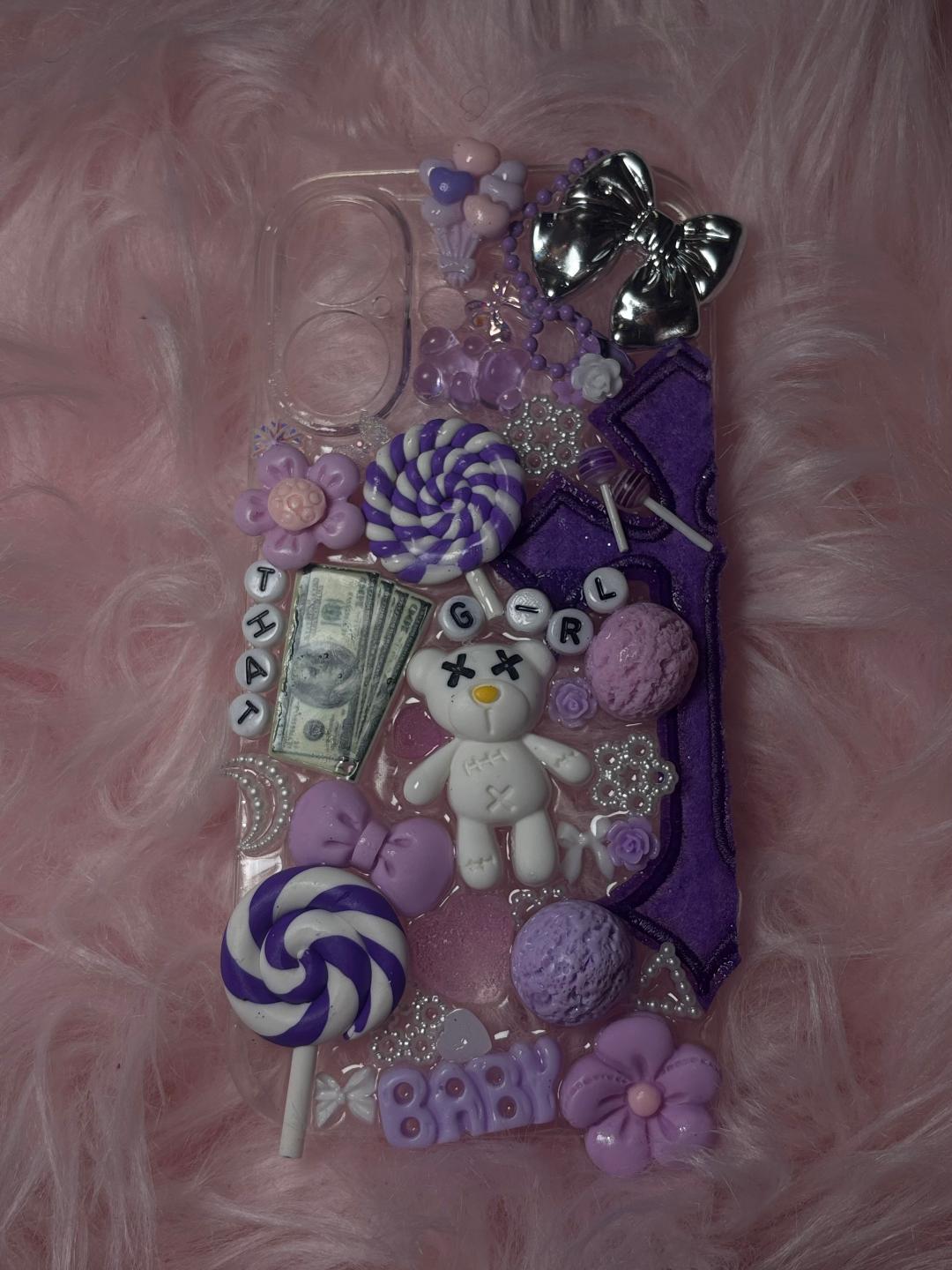 Indulge in the sweetest style with our Purple Candy Luxe case, designed for the iPhone 15 Plus. Featuring swirled lollipops, bows, flowers, and a playful teddy bear, this design mixes dreamy lavender tones with luxe metallic accents for a candy-coated masterpiece