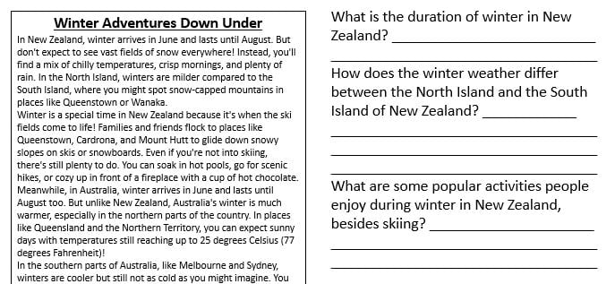 Aimed at Year 4 up, this resource includes a text to read all about winter time in New Zealand and Australia. The text comes with 5 comprehension questions all on a printable worksheet.