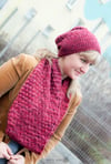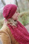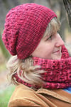 MALABRIGO Rastita: 100% Merino, 310 yards / 100 grams. You will need 2 skeins of yarn to make the set. Sample was made in color #33 Cereza.
