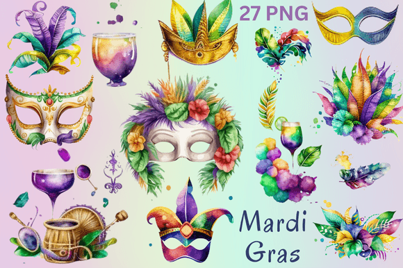 This is a set of 27 Mardi Gras Celebration Cliparts in PNG format and transparent background.