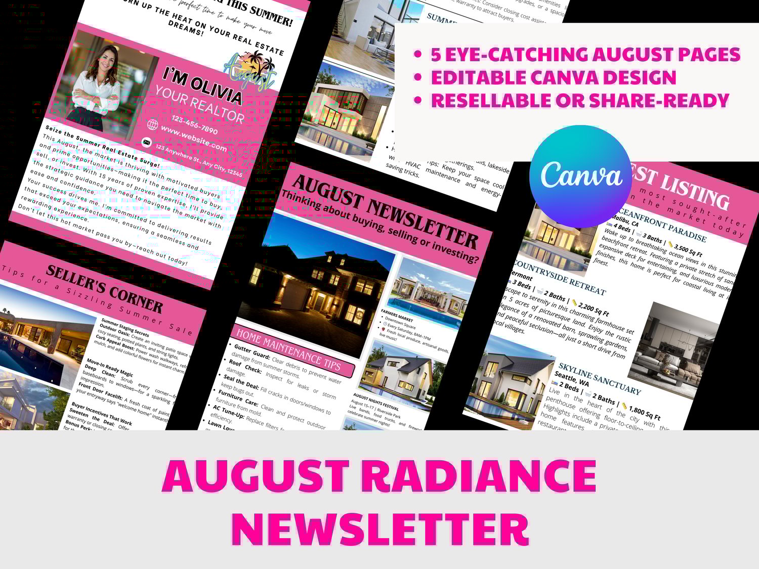 Shine bright this summer with the August Radiance Newsletter! 5 fully editable pages loaded with vibrant, modern designs perfect for any business. Personalize fonts, colors, text, and images in Canva. Ideal for newsletters, promotions, client updates, or creating resellable products. Print or share digitally — August Radiance makes your updates professional, fun, and totally on-trend. Turn your newsletters into a money-making opportunity while keeping your brand stylish!