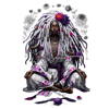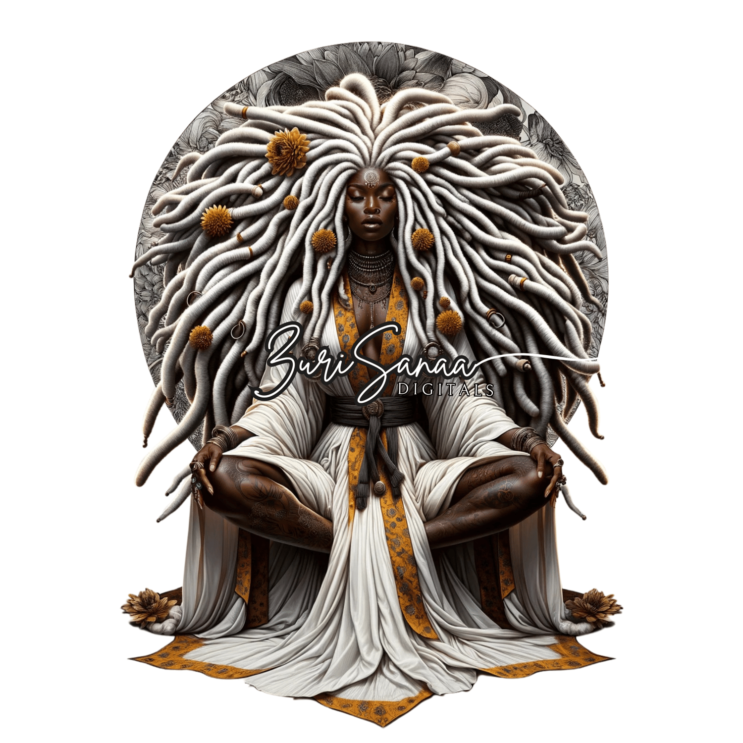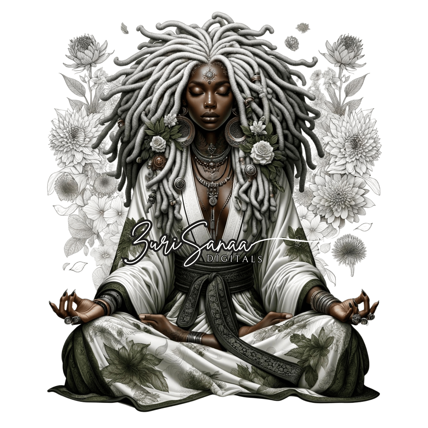 Elevate your creative projects with our exquisite bundle of 13 high-quality PNG images, featuring a serene, dark-skinned woman in a meditative pose. Each image showcases intricate details with voluminous dreadlocks adorned with rings, flowers, and elaborate jewelry. The flowing robe features various vibrant floral patterns and a dark belt, all against a transparent background for seamless integration into your designs.