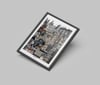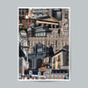 Collage minimalista de edificios icónicos de Madrid: Palacio de Cristal, Congreso de los Diputados, Templo de Debod y Edificio Metrópolis. Una composición urbana que celebra la diversidad arquitectónica de la ciudad.