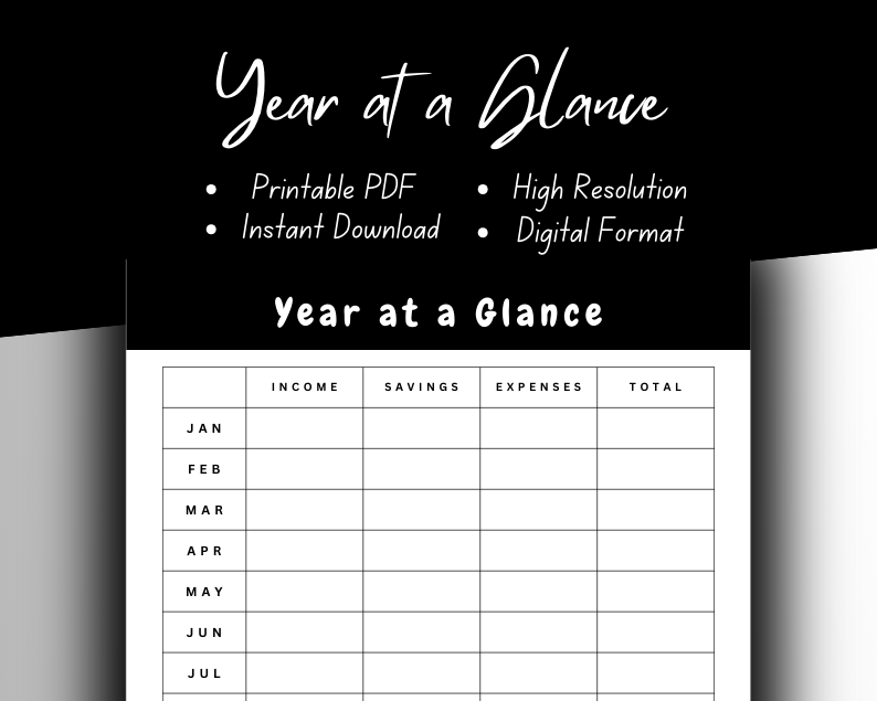 Year at a Glance Printable PDF | Instant Download | High Resolution | Digital Format
