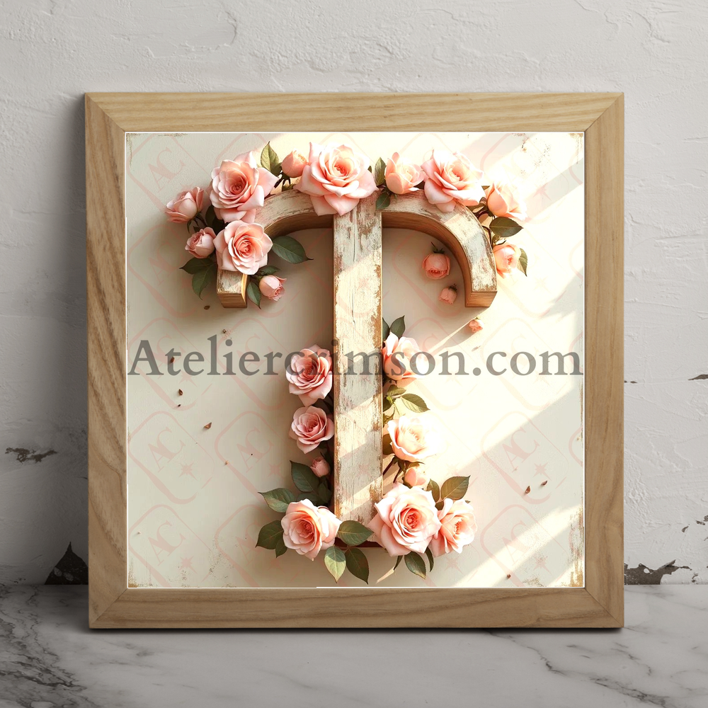 The letter T soft beige wood and flowers Download now this AI-generated image of an elegant, mid-century style character crafted from wood with a soft, neutral background with geometric pattern. Nostalgic and elegantly worn atmosphere.