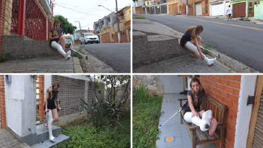 Julia is bored indoors. So, she decides to go to the sidewalk in front of her house to get some fresh air. A few cars and people pass by as Julia gently runs her hands over her cast. Then she goes to the bench in front of the house's garden, sits there, and shows off her cast and her feet.